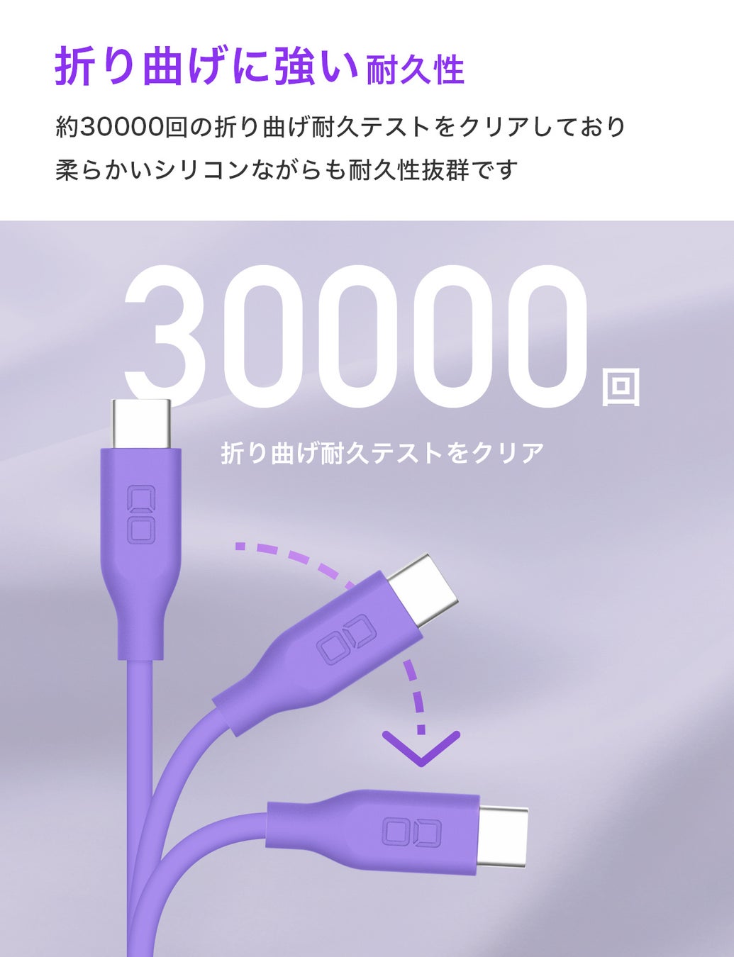 柔軟性と耐久性を持ち合わせ、30000回の折り曲げテストもパスしています。しなやかで断線しにくく高耐久仕様になっています。
