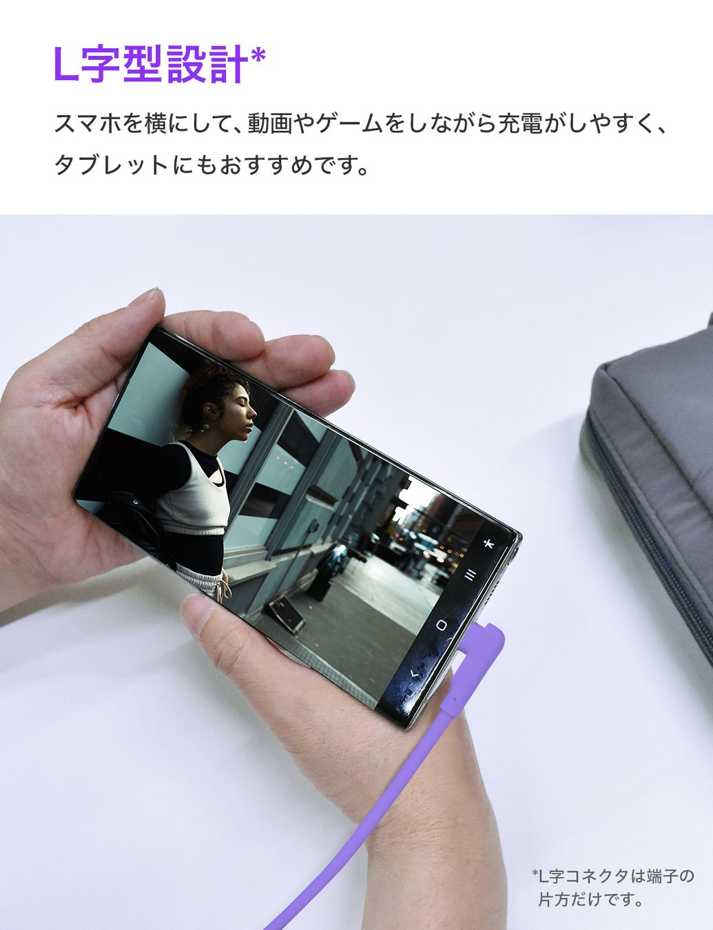 L字設計により横画面にてコネクタが邪魔にならないため、動画を視聴しながらやゲームをプレイしながらの充電がしやすくなっています。コネクタ部分が飛び出ないので、ケーブルの取り回しも大変便利です。
