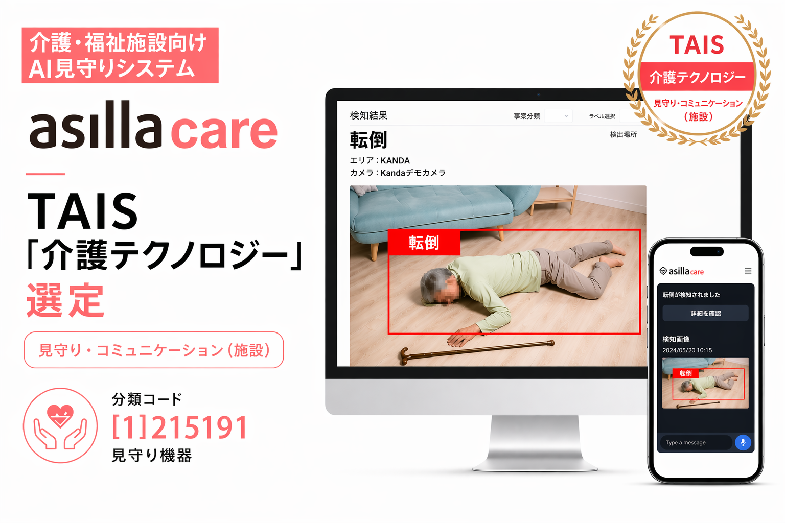 「テクノロジーの力で安心で快適な世界へ」をビジョンに掲げる株式会社アジラ(本社:東京都町田市、代表取締役CEO 尾上 剛、以下「アジラ」)は、当社が開発・提供する介護・福祉施設向けAI見守りシステム「asilla care」が、公益財団法人テクノエイド協会が運営する福祉用具情報システム(TAIS)において、「介護テクノロジー」(見守り・コミュニケーション(施設))に選定されたことをお知らせします。