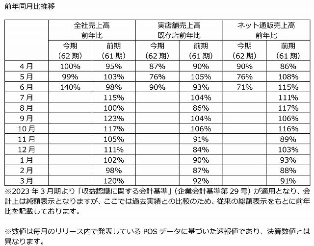 株式会社セキド(本社・東京都新宿区、社長・関戸正実、証券コード:9878)は、2023年6月度(5月21日~6月20日)の売上高が、全社の前年比140%、GINZALoveLove実店舗の既存店前年比90%、ネット通販の前年比71%となりました。なお、数値はPOSデータに基づいた速報値であり、決算数値とは異なります。