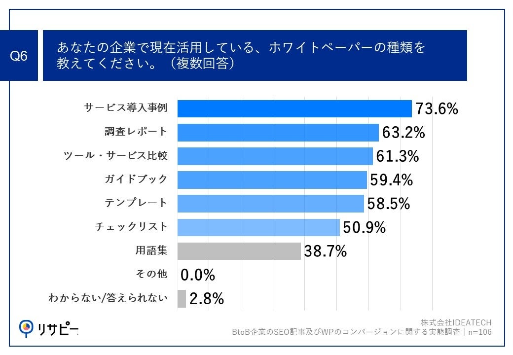 「Q6.あなたの企業で現在活用している、ホワイトペーパーの種類を教えてください。(複数回答)」(n=106)と質問したところ、「サービス導入事例」が73.6%、「調査レポート」が63.2%、「ツール・サービス比較」が61.3%という回答となりました。