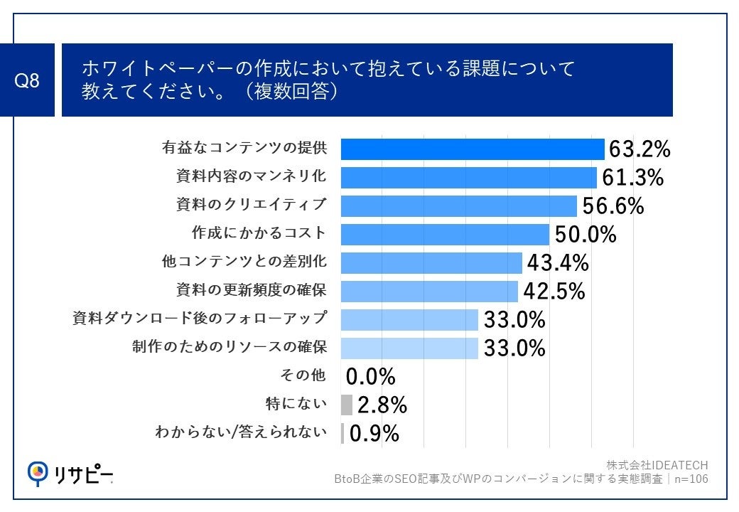 「Q8.ホワイトペーパーの作成において抱えている課題について教えてください。(複数回答)」(n=106)と質問したところ、「有益なコンテンツの提供」が63.2%、「資料内容のマンネリ化」が61.3%、「資料のクリエイティブ」が56.6%という回答となりました。