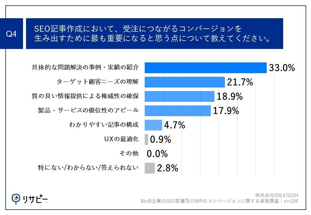 「Q4.SEO記事作成において、受注につながるコンバージョンを生み出すために最も重要になると思う点について教えてください。」(n=106)と質問したところ、「具体的な問題解決の事例・実績の紹介」が33.0%、「ターゲット顧客ニーズの理解」が21.7%、「質の良い情報提供による権威性の確保」が18.9%という回答となりました。