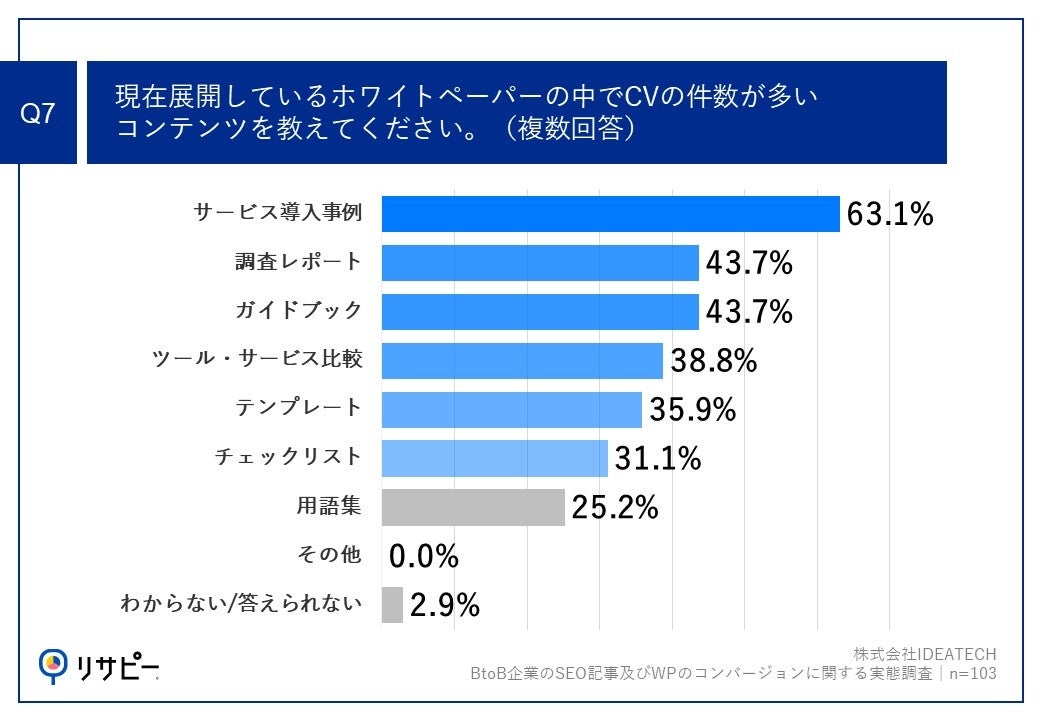 「Q7.現在展開しているホワイトペーパーの中でCVの件数が多いコンテンツを教えてください。(複数回答)」(n=103)と質問したところ、「サービス導入事例」が63.1%、「調査レポート」が43.7%、「ガイドブック」が43.7%という回答となりました。