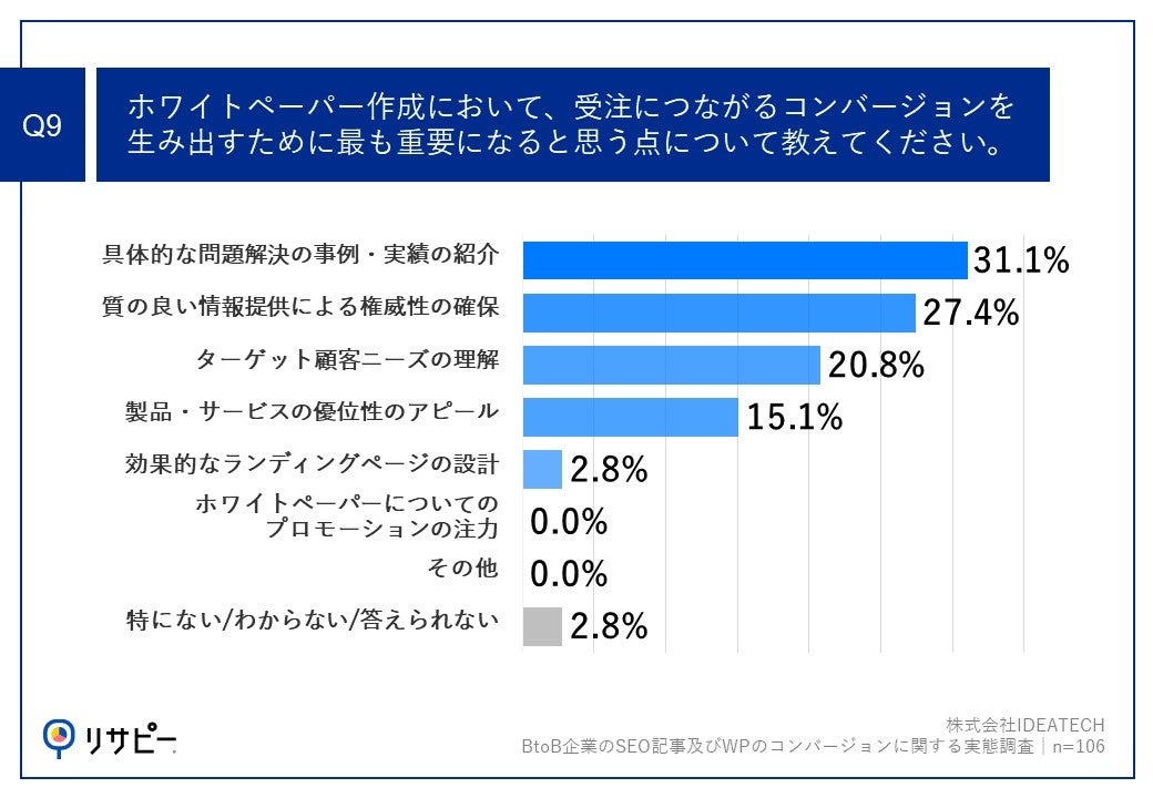 「Q9.ホワイトペーパー作成において、受注につながるコンバージョンを生み出すために最も重要になると思う点について教えてください。」(n=106)と質問したところ、「具体的な問題解決の事例・実績の紹介」が31.1%、「質の良い情報提供による権威性の確保」が27.4%、「ターゲット顧客ニーズの理解」が20.8%という回答となりました。