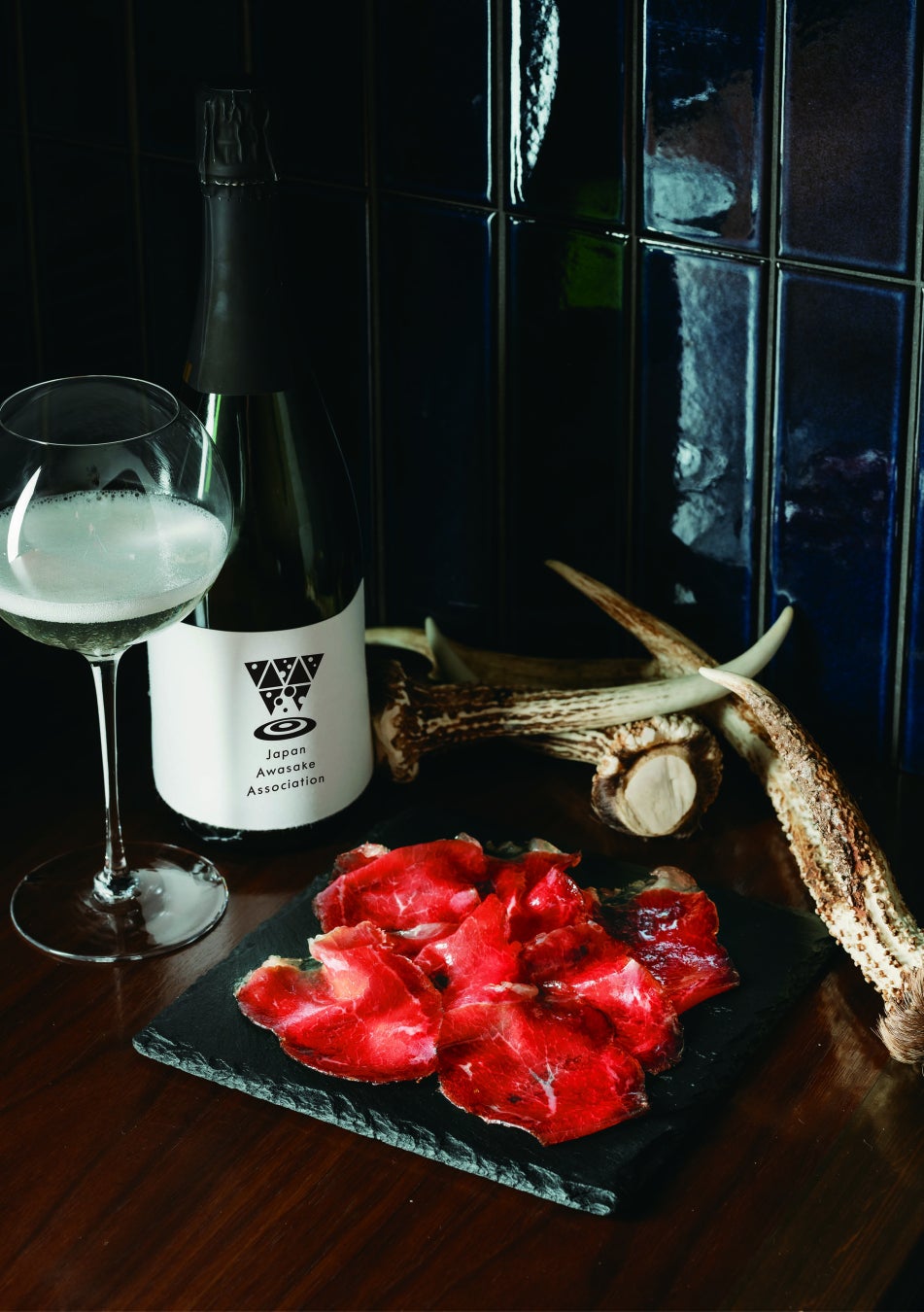 短角牛の生ハムは、赤ワインに3週間漬け込んで生ハムと同じように熟成。乳酸発酵しているため、芳醇な風味がawa酒の風味を引き立たせます。