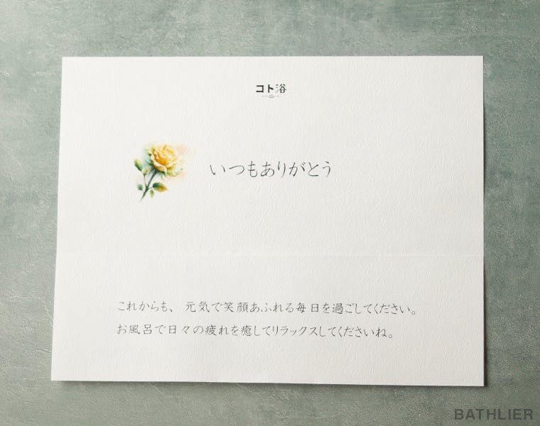 大人になると、照れくさくて感謝の気持ちをなかなか直接伝えられないもの。「コト浴 セレクションセット」には、そんなあなたの想いをメッセージにしたためて同封しております。