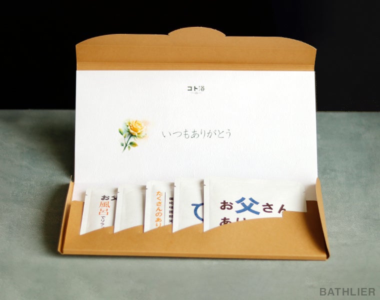 父の日限定「コト浴 父の日セレクション」のパッケージには、お父さんに向けての「気持ち」や「言葉」が綴られています。 日頃の疲れを癒し、「まるで温泉に浸かっているような」気分を味わえる入浴剤を、 父の日限定のメッセージを添えて、特別なパッケージでお父さんのもとへお届けします。