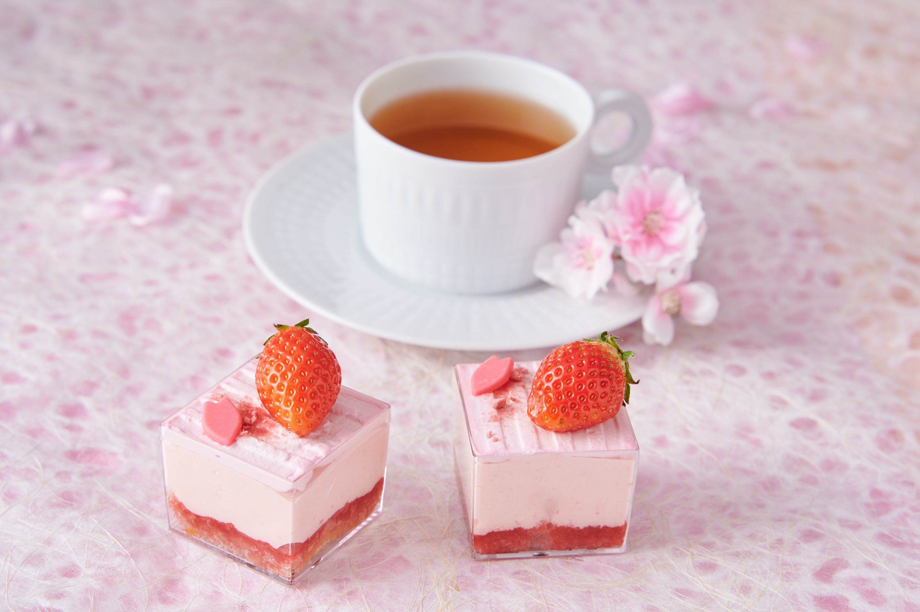 中に苺を忍ばせた桜モンブランや、桜型の最中、苺のエキスをたっぷりと浸み込ませたスポンジに桜マスカルポーネクリームを重ねたティラミスなど、桜の花びらのように美しいベビーピンクで統一された心華やぐスイーツの数々が並びます。