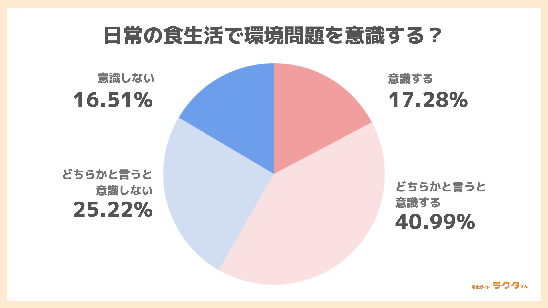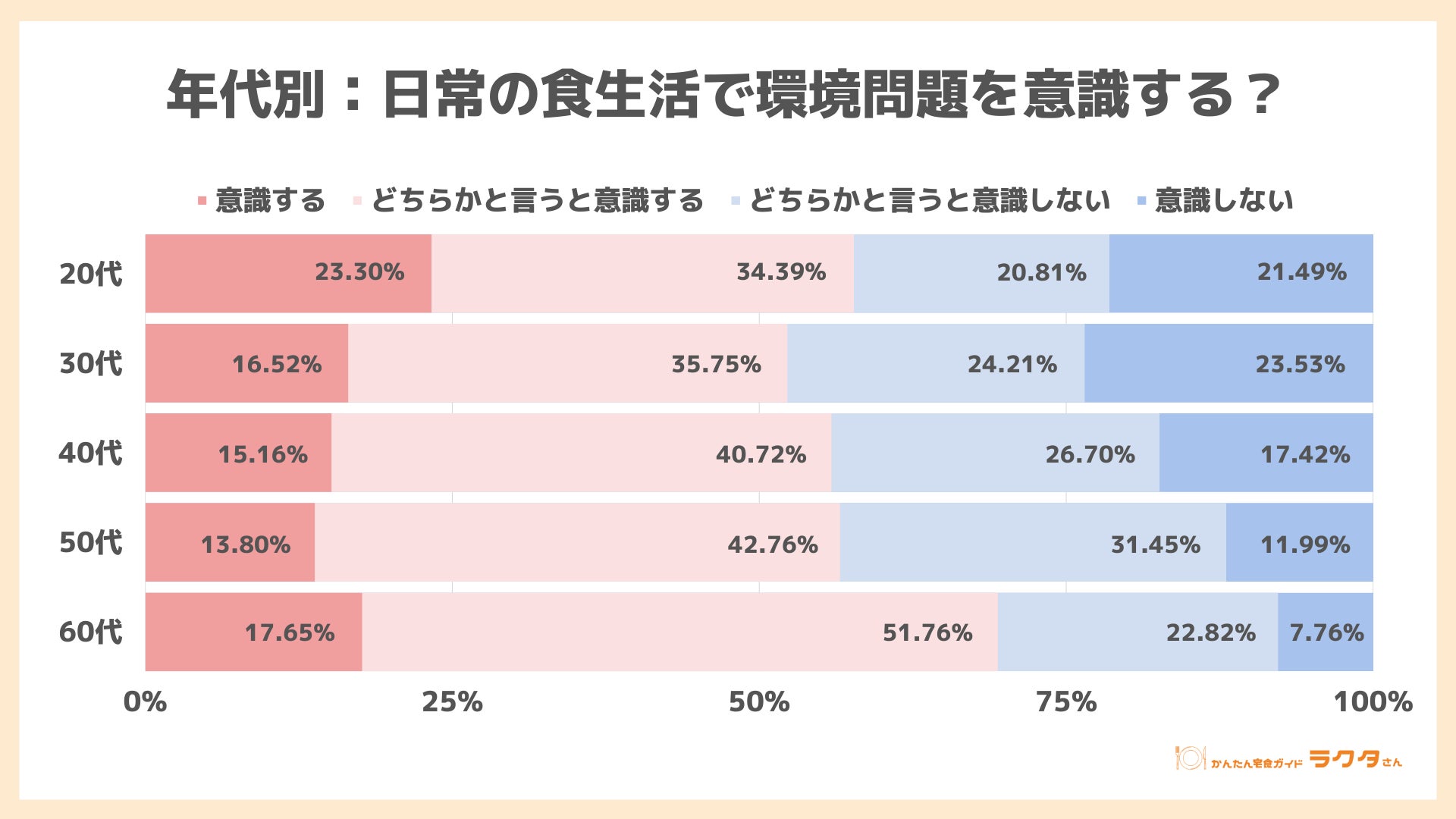 ナイル株式会社(本社:東京都品川区、 代表取締役社長:高橋飛翔、 以下ナイル)が運営する「かんたん宅食ガイド ラクタさん」にて、20代~60代男女2,193人を対象に、2023年4月4日~4月11日の期間で、食生活と環境問題に関するアンケートを実施しました。