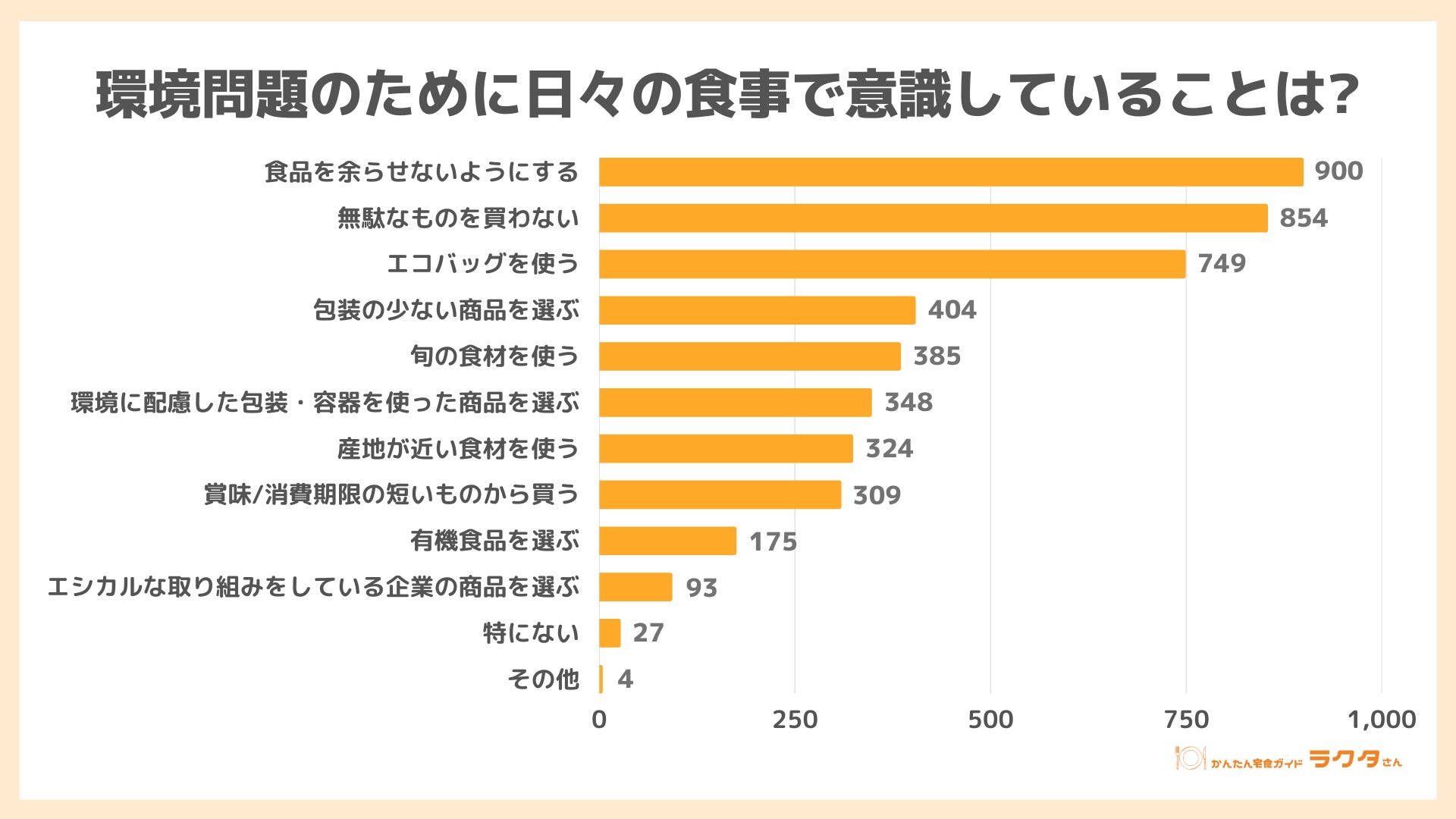 最も多かった回答は「食品を余らせないようにする」で900人。続いて、「無駄なものを買わない」が854人、「エコバッグを使う」が749人となりました。これらの結果から、環境問題に意識的な人々は、日々の食事において廃棄物を削減する行動を積極的に取り入れていることがわかります。