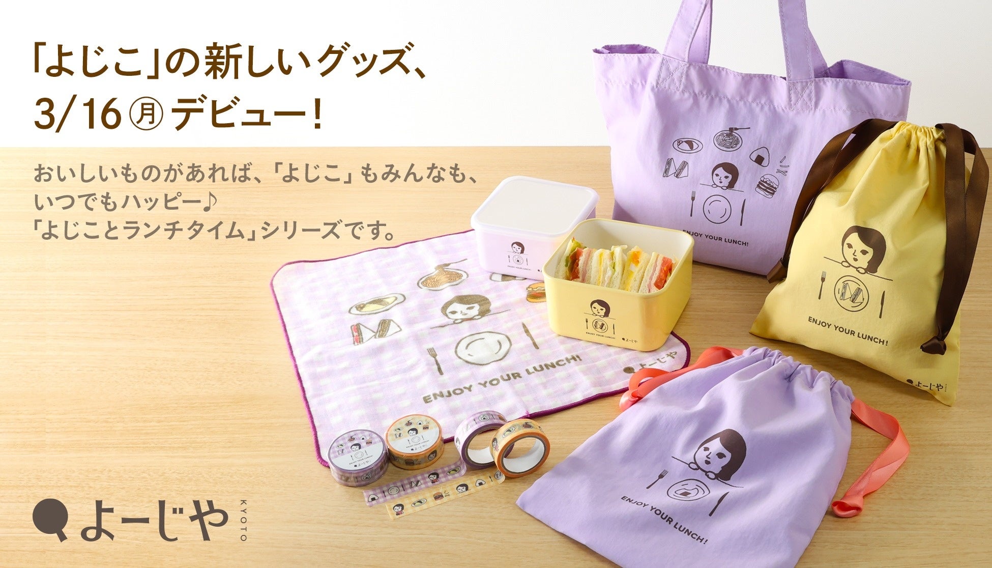 株式会社よーじや(京都府京都市下京区、代表取締役・國枝昂)が運営する、京都発のライフスタイルブランド「よーじや」は、2026年3月16日(月)より、コーポレートキャラクター「よじこ」のグッズ第3弾を販売いたします。今回の「よじことランチタイム」シリーズは、ランチメニューに迷ったり、大好物を食べたりする楽しみをテーマにした「よじこ」のイラストを、学校やオフィスなど新生活に役立つアイテムにデザイン。ラベンダーとイエローがかわいらしいグッズを展開いたします。サブバッグとしても使えるランチトートや使い勝手のいいフードコンテナなどが登場。「よじこ」グッズとともに、新生活をスタートしませんか?