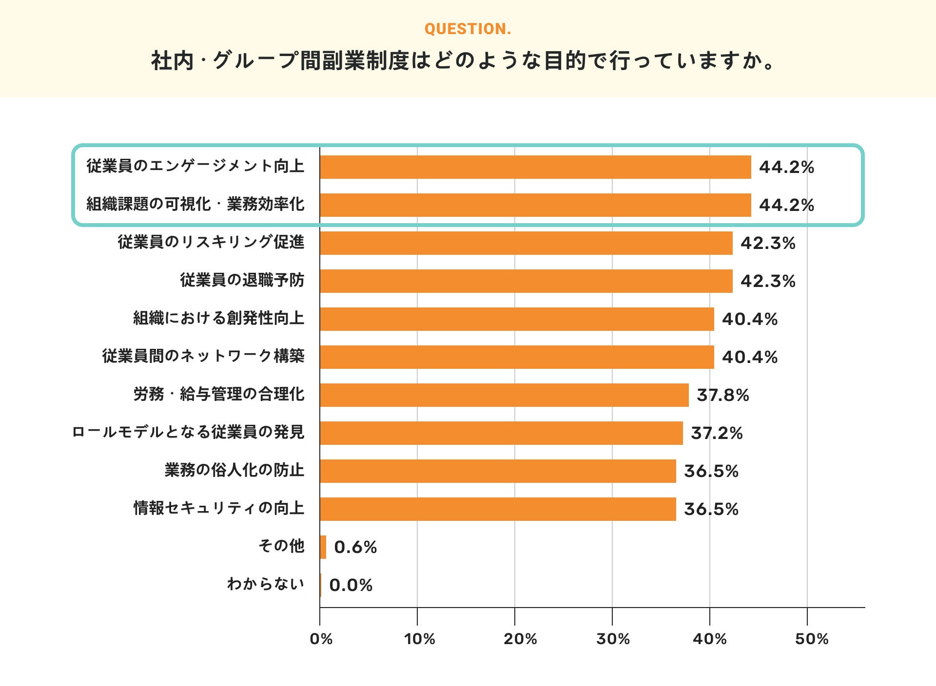 社内・グループ間副業制度をいつ頃導入したか尋ねたところ、2020年の回答が最も多く、33.3%となりました。2020年は、コロナの流行で世の中のはたらき方が大きく変化した年でもあるので、各企業の副業制度の実施検討にも大きな影響を与えたことが伺えます。また、社内・グループ間副業制度を実施する目的について尋ねると、“従業員のエンゲージメント向上”と“組織課題の可視化・業務効率化”の回答が44.2%で同率1位となりました。