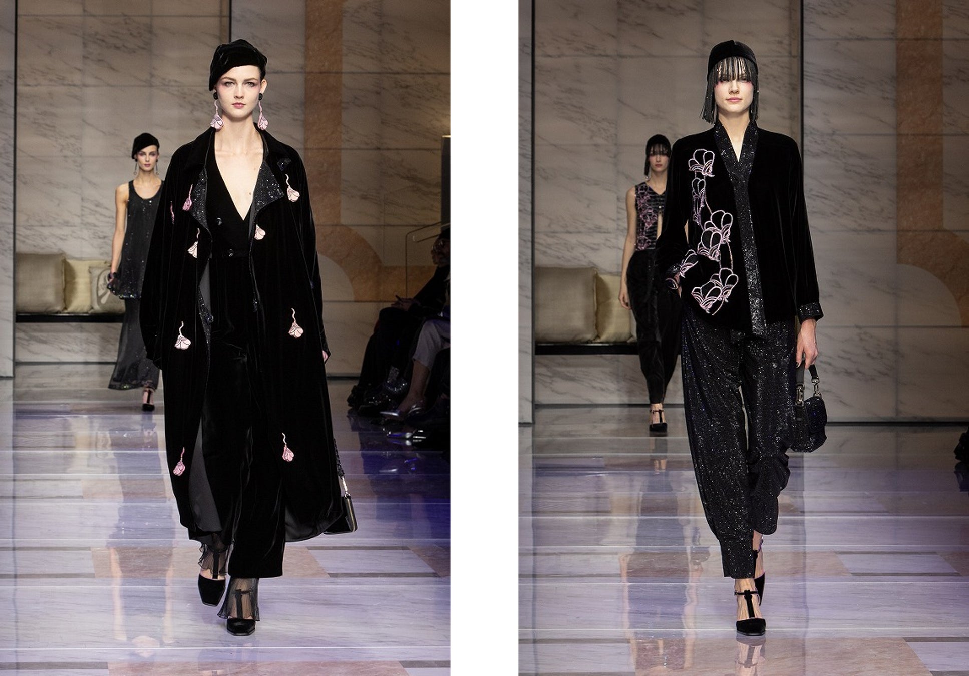 優美で上品なフラワーモチーフがコレクションの気品を象徴するようかのように繰り返し登場します。衣服から「ジョルジオ アルマーニ ラ プリマ」の新モデルを含むアクセサリーに至るまで、シャイニーとマットな素材が絶妙なバランスでコレクションが奏でる一連のストーリーを演出しました。