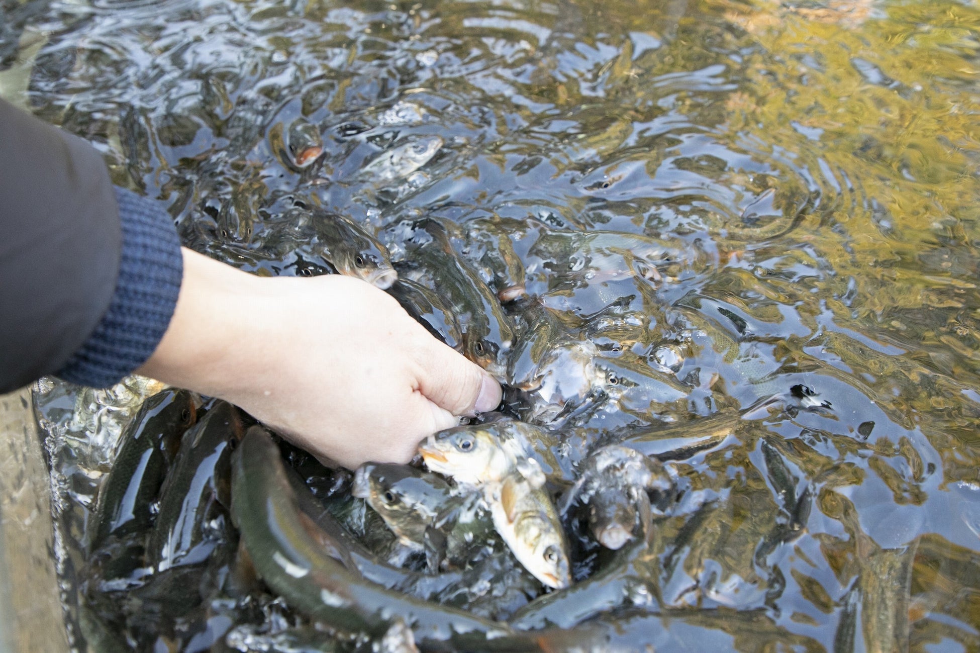 「子どもの施設使用料無料化」対象施設でもある本施設では、コイなどの川魚に餌やりができる「お魚にごはん」が大人気で、これを目的に毎日のように来館する子どもだちもいるそうです。ツアー参加者にも餌やりを楽しんでもらい、川魚の迫力を体感していただきました。