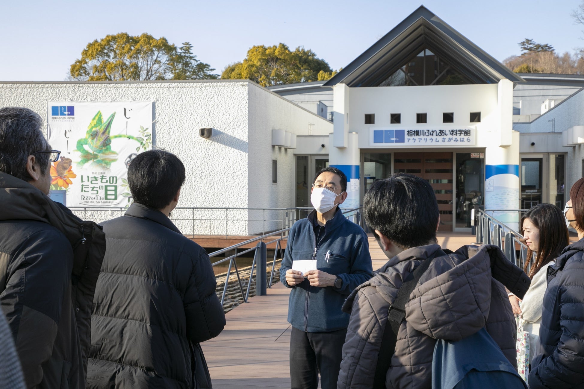最後の訪問先は、“相模川の自然に親しみ、守り育てる心をはぐくむ施設”として昭和62年の開館から多くの市民らに愛されている「相模川ふれあい科学館 アクアリウムさがみはら」です。相模川の水源から河口までの全長113kmを長さ40mの水槽で表現する装置が特長的で、相模川とその周辺に生息する淡水魚を中心に約100種類の生き物たちを展示しています。現在は、新江ノ島水族館を運営する株式会社江ノ島マリンコーポレーションが指定管理者として、様々な企画展を随時実施しています。