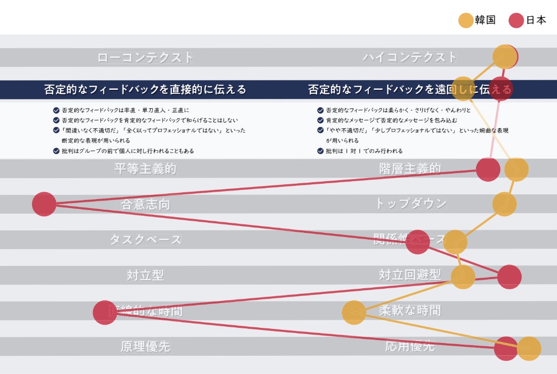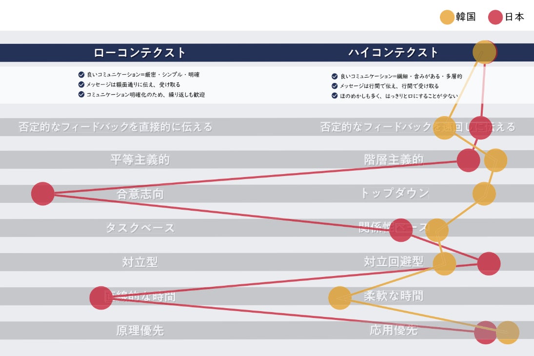 ただし、ハイコンテクストであるという点では日本同様であるものの、韓国では、自分の意見を主張することが好ましいとみなされる点が日本との違いです。