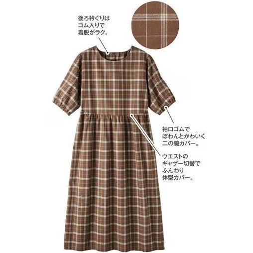 ふんわり感のあるシルエットとゴム入りのぽわんとした袖で、気になる二の腕から体型全体までやさしくカバー。締めつけ感がなく風通しも良いので、暑さの残る季節でも快適にお過ごしいただけます。