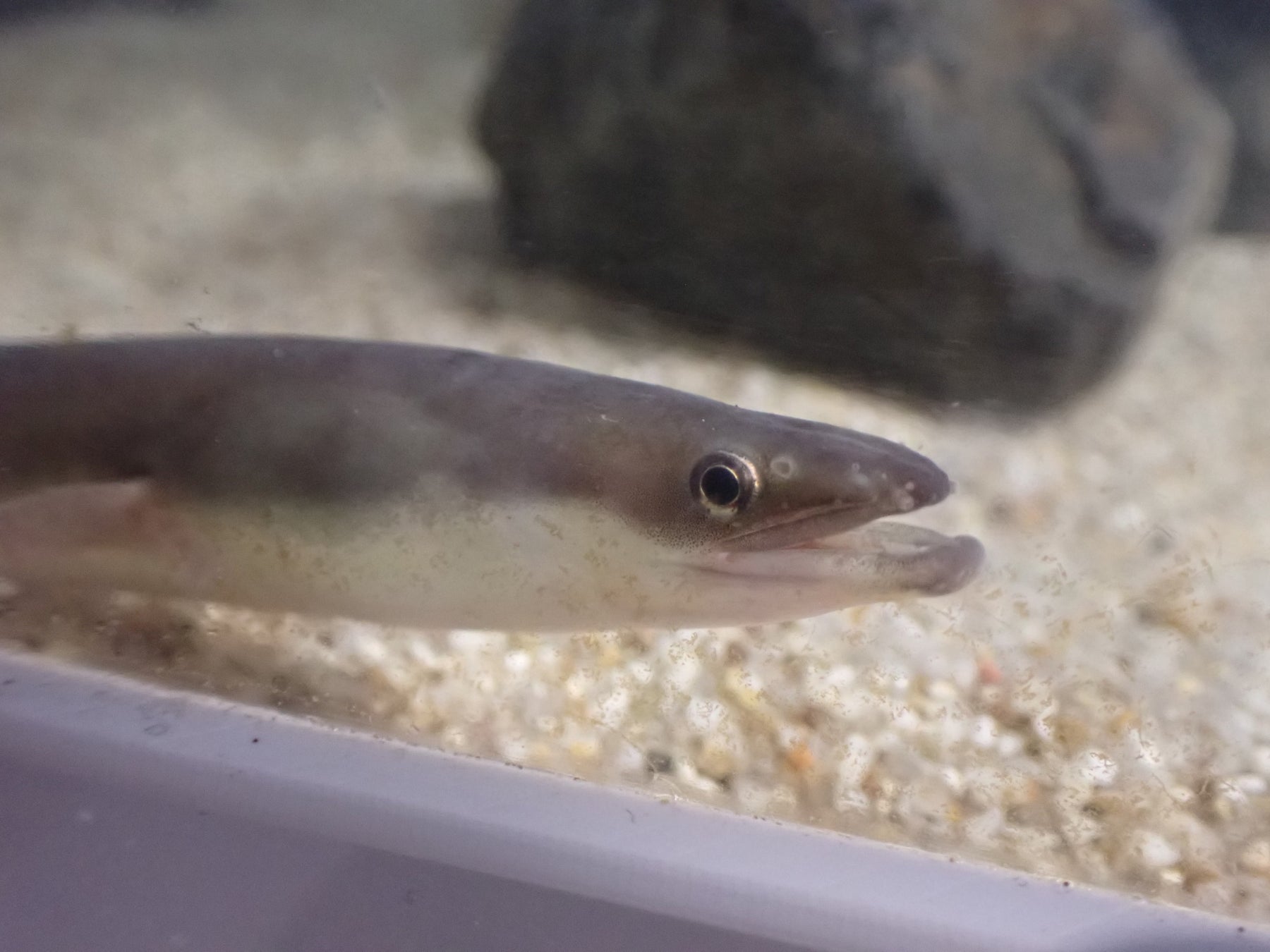 今回は、天然ウナギの旬に合わせ「ニホンウナギ」を展示いたします。当館で飼育しているニホンウナギは、なんと“海”で見つかった個体です。「ウナギが海に?」と驚かれる方も多いかもしれません。数年前には大阪の道頓堀川でニホンウナギが発見され話題となりましたが、やはり「川に生息する魚」というイメージが強いかもしれません。実際には、ウナギは川だけでなく、海や淡水と海水が混じり合う汽水域にも生息しています。