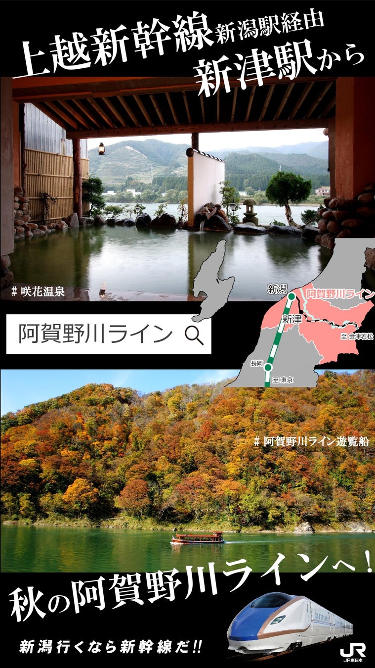 9月19日~10月6日のPRでは、阿賀野川ラインをご紹介。福島から新潟へ、県境の険しい山岳地帯を経て新潟平野をゆったりカーブしながら日本海に流れ込む阿賀野川。その豊かな水の流れと渓谷の美しさは日本百景にも数えられるほど。川沿いには効能豊かな温泉や四季折々の景観を楽しめるスポットが点在し、見どころ満載。紅葉シーズンは10月下旬~11月上旬。今年の秋は阿賀野川ラインへ!