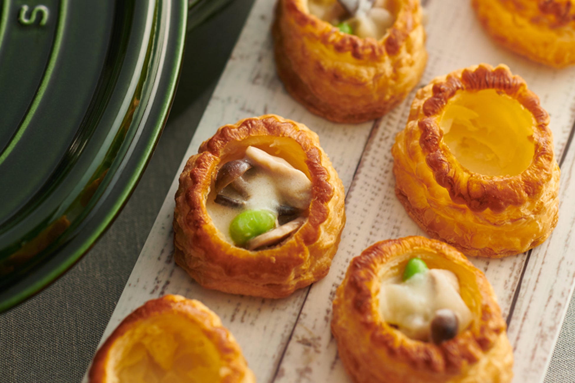 サクサクのパイ生地をお皿に見立て、チキンとキノコのクリーム煮をたっぷり流し込んでお召し上がりください。フランスの定番家庭料理です。