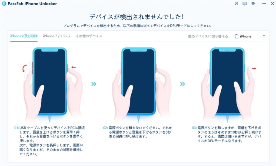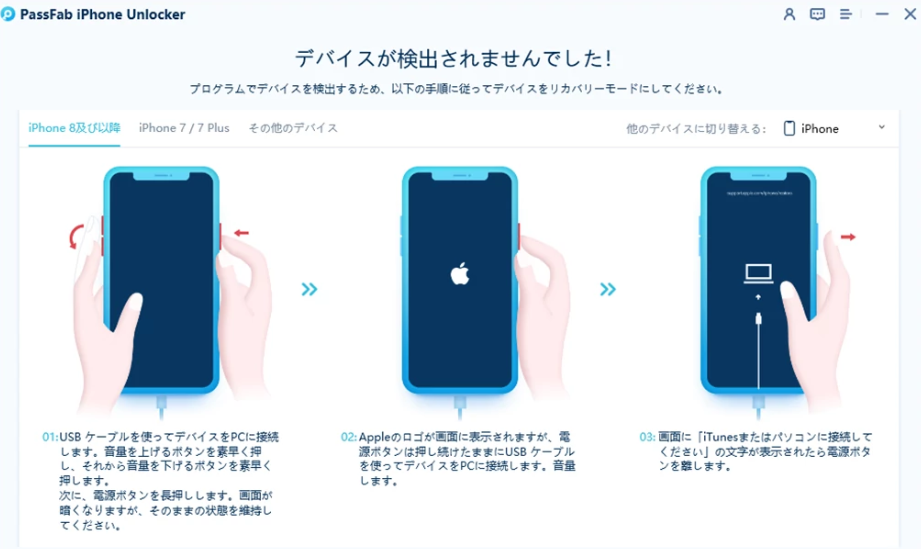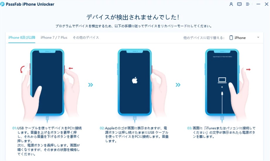 Step1:iPhoneを接続したところで、「デバイスが検出されませんでした」というメッセージが表示された場合は、リカバリーモードまたはDFUモードにするよう指示画面が出ますのでそちらに従ってください。