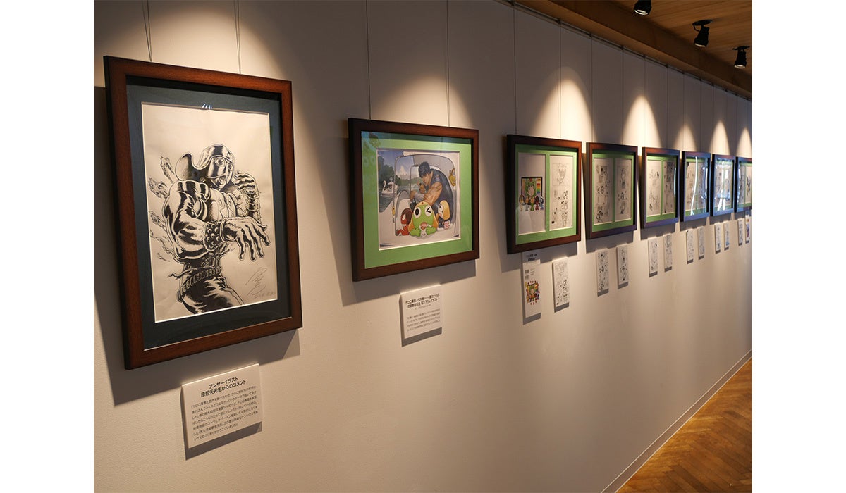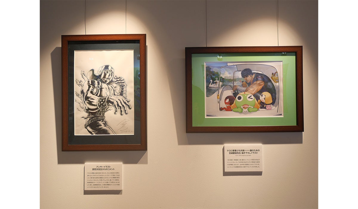 2階へ上がると、原哲夫が描き下ろしたケロロがまず目に飛び込んできます。原哲夫は、“ケロロ軍曹と筋肉を掛け合わせ、さらに世紀末に連れ込んでみたらどうなるか、というテーマで描いた”とコメントしています。そして隣には、吉崎観音先生がこの展示会のために描き下ろした吉祥寺要素満載の、ケンシロウとケロロのコラボイラストが展示されています。