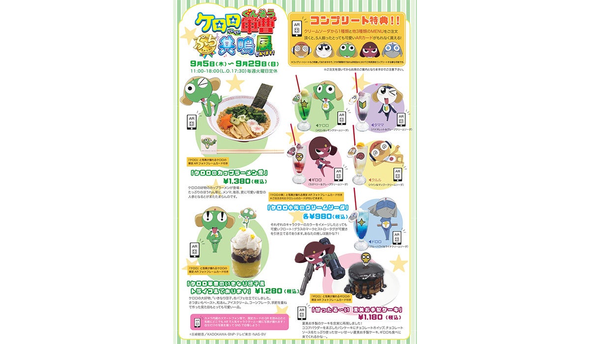 ファンにとってたまらないメニューが目白押しです。ぜひ作品の魅力がたっぷり詰まった「ケロロ軍曹 ぷち共鳴(ゲロゲロ)展であります!」会場のギャラリーゼノンに、足を運んでみてください。