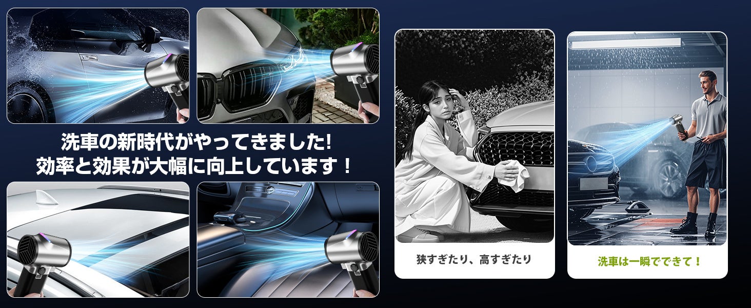 300,000回転/分のモーターを搭載。10cmの距離から1.8kgまでの物体を吹き飛ばせる力を持ち、台風級の風力で洗車や除雪を瞬時に完了。時間を大幅に短縮し、手間のかかる拭き上げ作業も不要です。