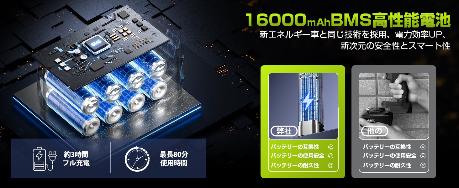 16000mAhの大容量バッテリー(PSE認証済)を内蔵し、外部電源不要で使用可能。ブラシレスモーターと最適化構造により作動音を大幅に抑え、付属のノイズキャンセルヘッドホンでさらに快適に利用できます。高輝度LEDライト搭載で、暗所作業にも対応。