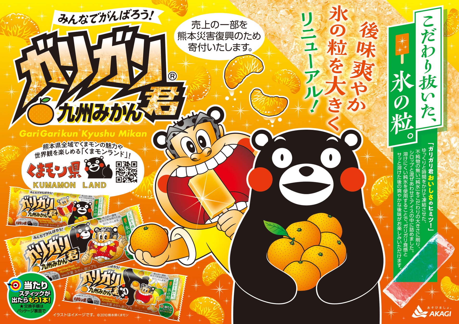7年目を迎える、ガリガリ君とくまモンのコラボ商品!くまモンの魅力や世界観を楽しめる「くまモンランド」をPR!売上の一部を熊本災害復興のため寄付いたします。「ガリガリ君九州みかん」