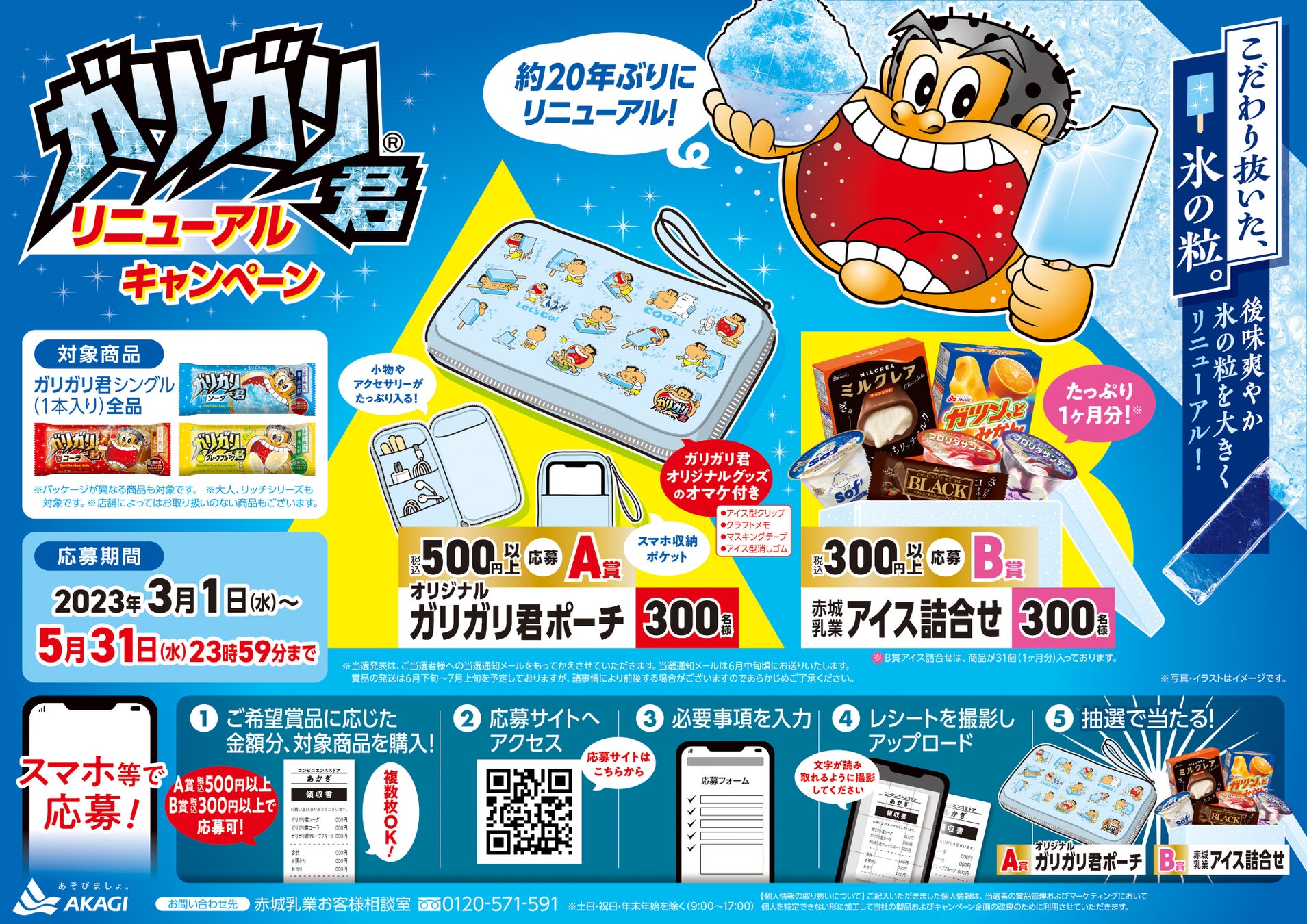 ・応募方法 対象商品を税込500円、または税込300円以上購入したレシート(複数枚可)の写真をキャンペーンサイトよりアップロードしてご応募ください。後日、抽選でオリジナルガリガリ君ポーチや赤城乳業アイス詰め合わせをプレゼントいたします。