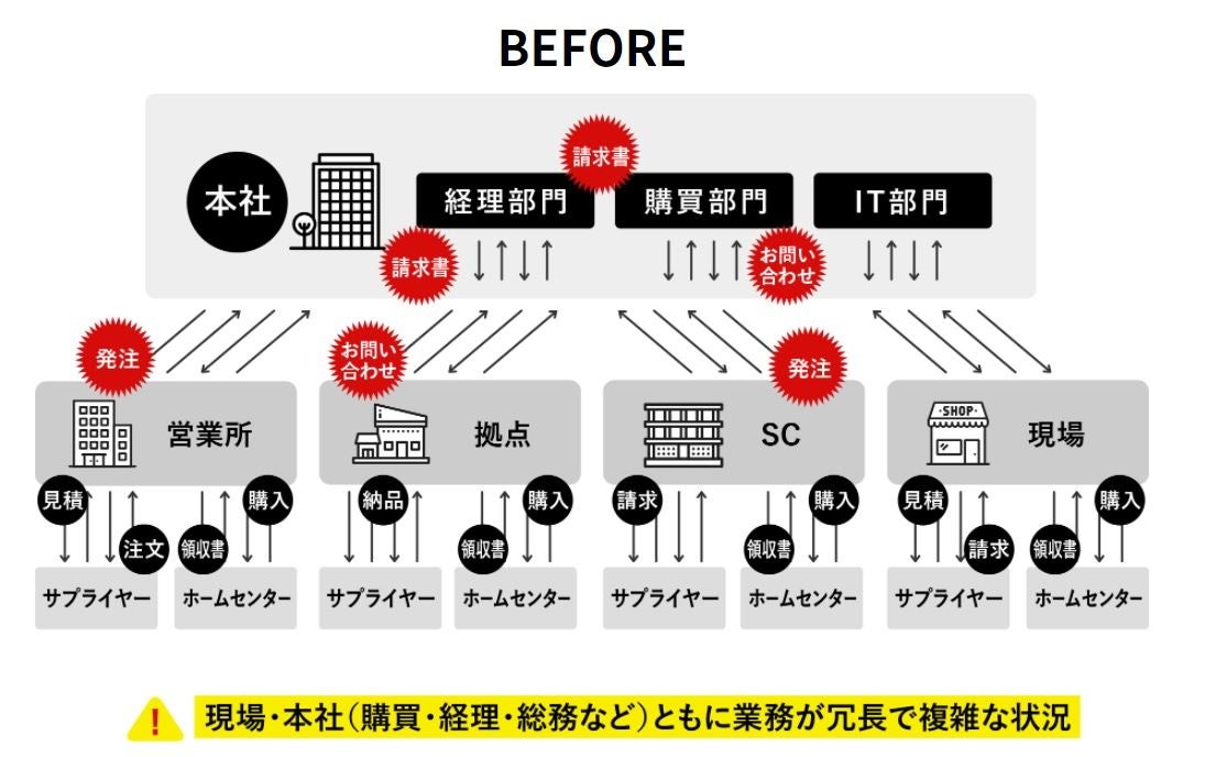・昨今のDX推進の波の中で、業務効率化に積極的に取り組まれているものの、間接資材の購買については全社員が関わる部分であり改善が難しい。また、上記に加え、紙による申請・経費処理などの課題も残っていることが調査により分かってきた。