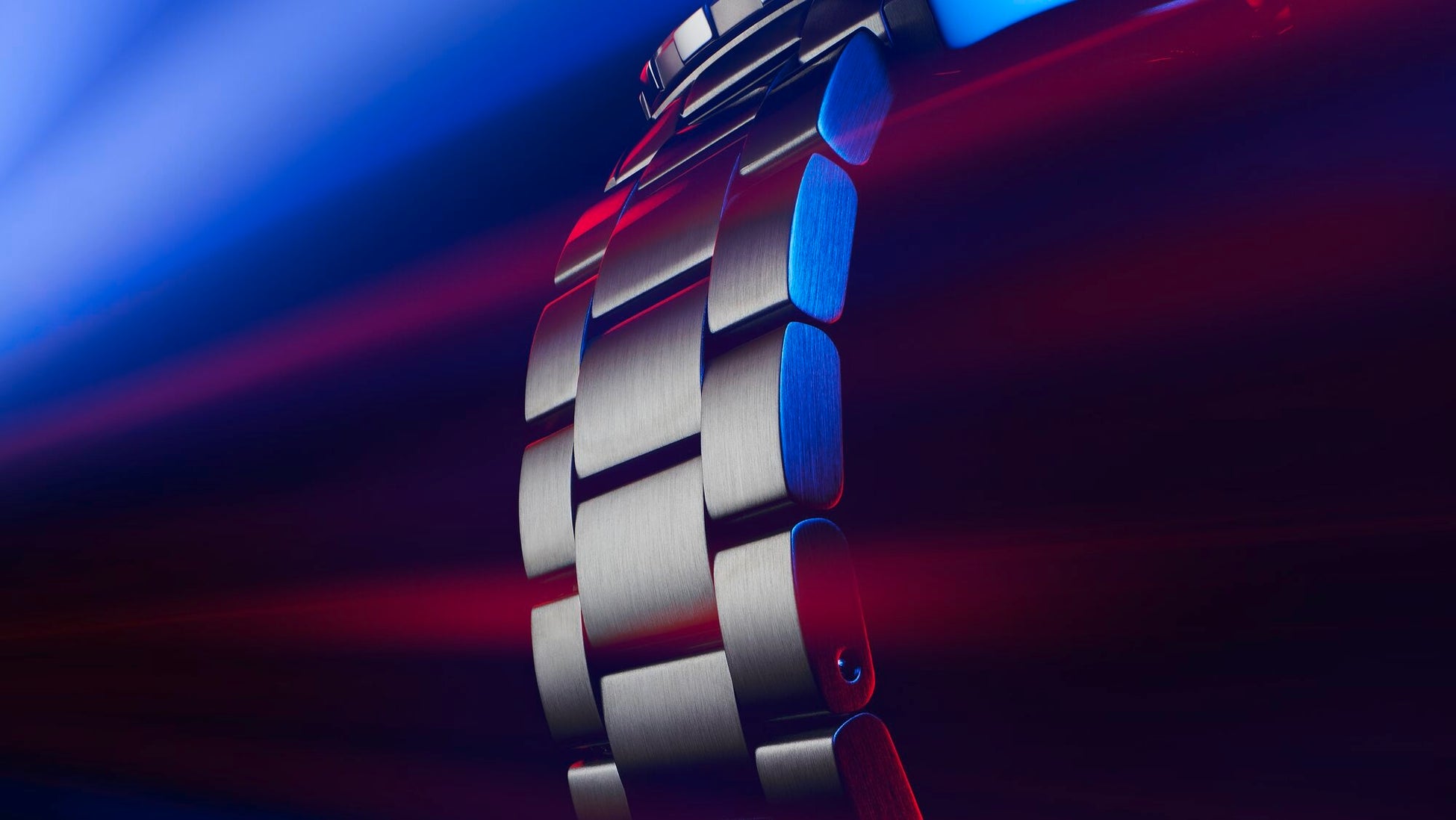 デザイナー陣は、神話的な深みのあるブルー、印象的なレッドの色調など、レッドブル レーシングチームの大胆な色を強調しました。鮮やかなイエローとレッドで仕上げられたカスタマイズの目盛り表示が付いた、新たなブルーのサンブラッシュド仕上げダイヤルは、その絶好の例です。 6時位置の1/10秒を計測するクロノグラフカウンターにも、イエローとレッドのディテールが施されており、クロノグラフ中心の秒針もイエローでハイライトされています。