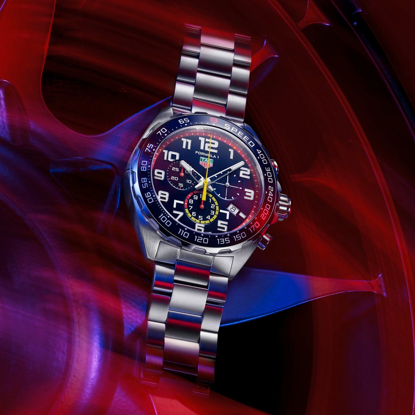 新作「タグ・ホイヤー フォーミュラ1 クロノグラフ レッドブルレーシング スペシャルエディション」は、レッドブル レーシングの全てのファンの心をつかみます。大胆さを増したデザインと高度な技術的特徴により、F1とレッドブル レーシングのファンのために作られた完璧なタイムピースです。