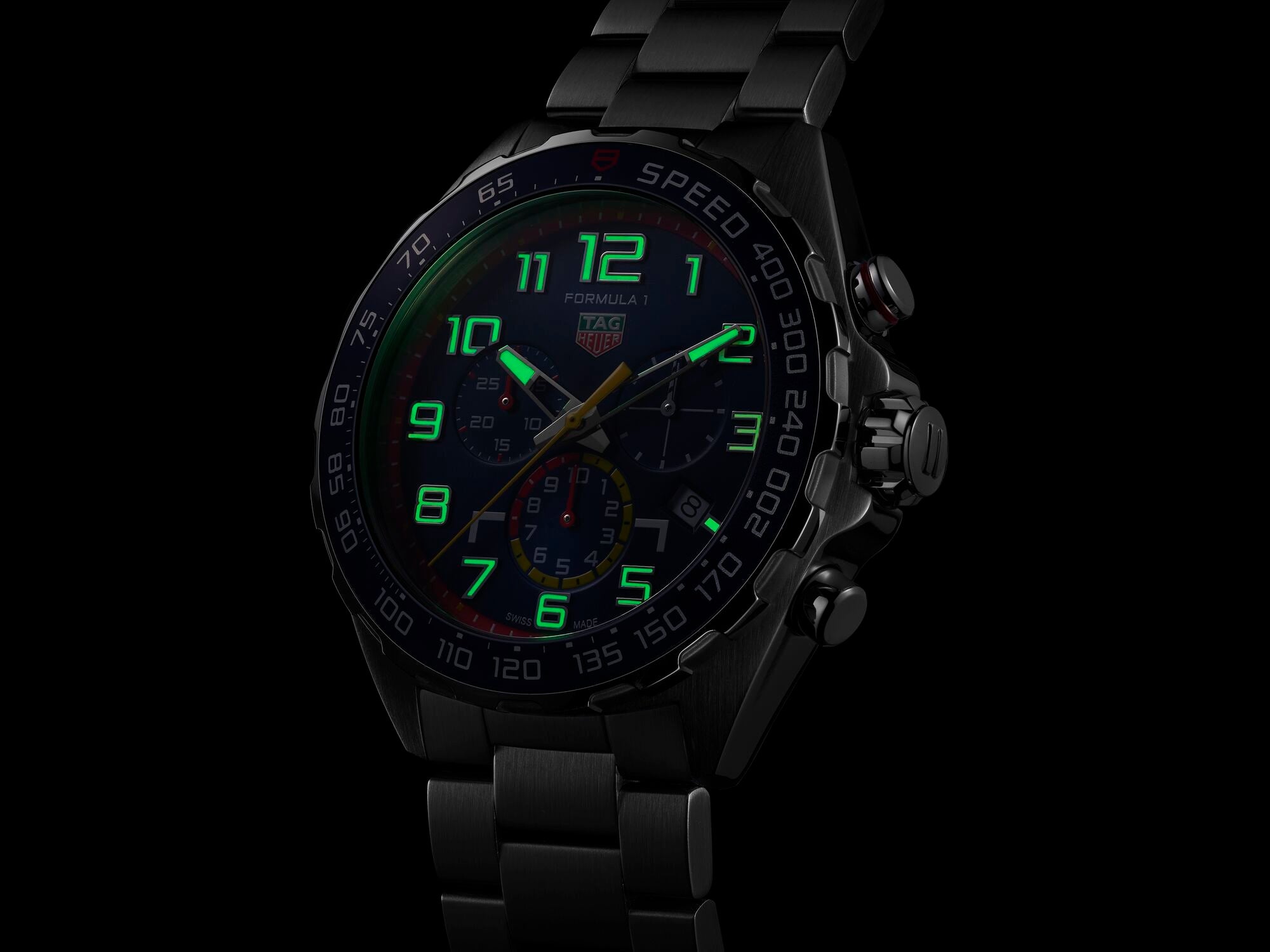 アラビア数字のインデックスは、レーシングカーの速度計から直接インスピレーションを得たものです。F1に通じた人であれば、数字の5と7の上のラインの形が大好きなスポーツを巧妙に表していることにも気付くでしょう。 この線は、F1トラックのスタートラインを連想させるデザインとなっています。新たなダイヤルも、F1カーのコックピットからインスピレーションを得たものであり、あらゆ るコンディションにおいて、視認性が高く時間が読みやすいようになっています。