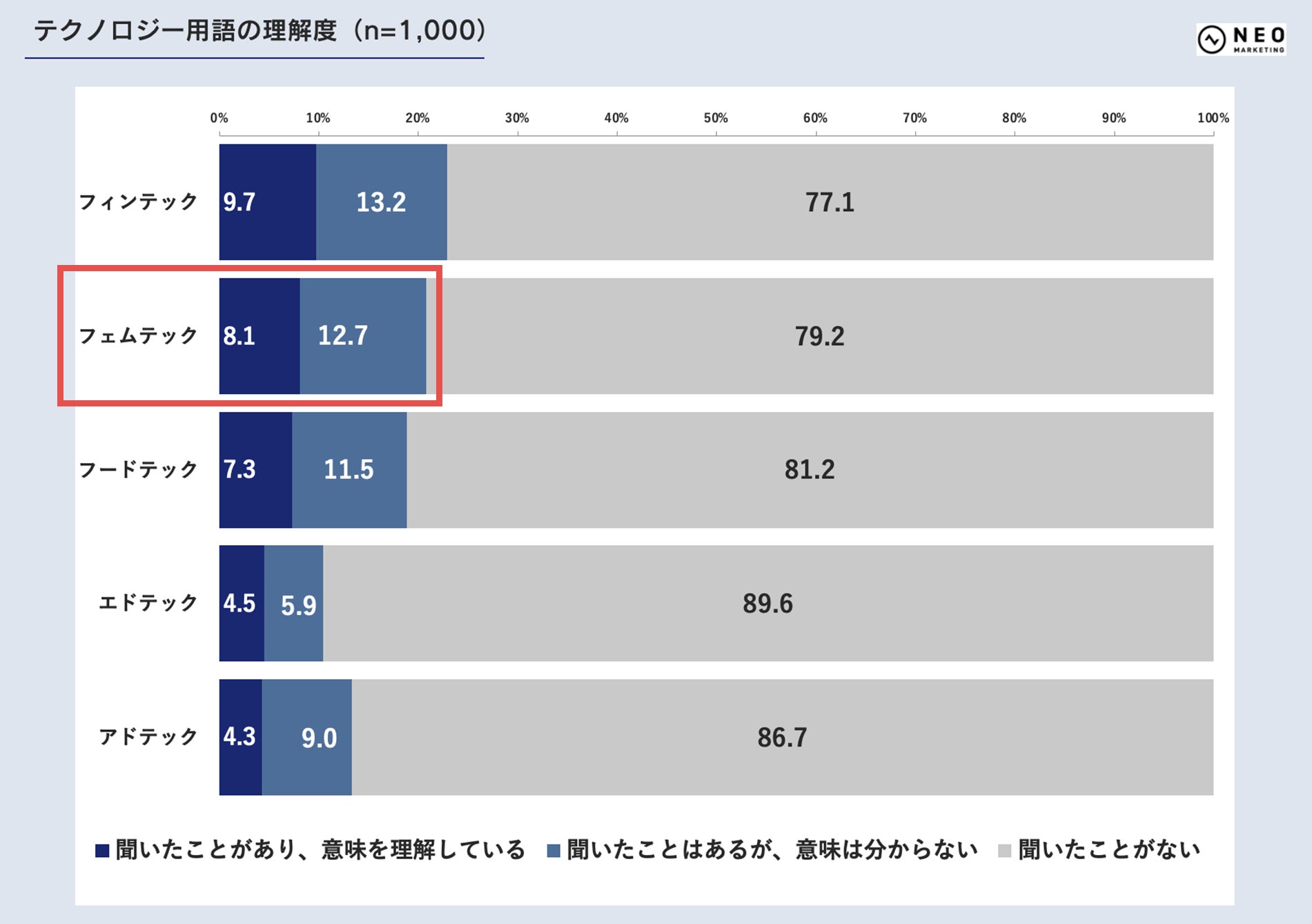いずれの用語についても「聞いたことがあり、意味を理解している」割合は10%以下にとどまりました。本調査のテーマ「ウィメンズヘルス」に関係する「フェムテック」(※)は、近年世界的に注目されている分野ですが、やはり認知度が高いとは言えないようです。