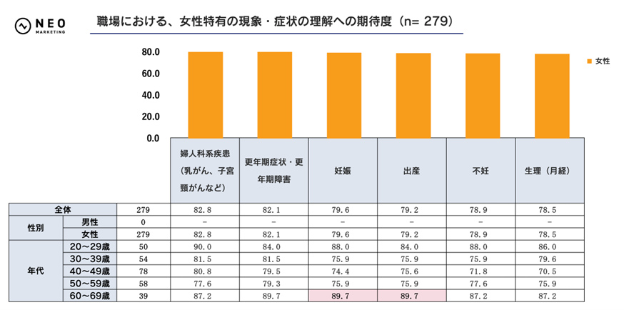 全体的に約80%〜90%の割合となっており、女性の有職者のほとんどが職場に対し各現象・症状への理解を求めていることがわかります。「不妊」「生理(月経)」については、女性の間でも年代ごとで差が大きく、前者は最大16.2ポイント、後者は最大16.7ポイントの差が生じていました。