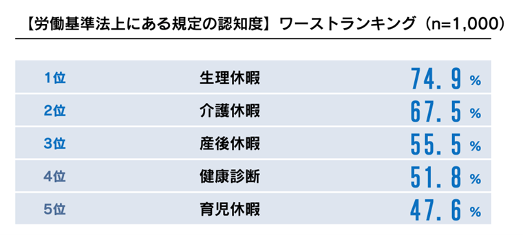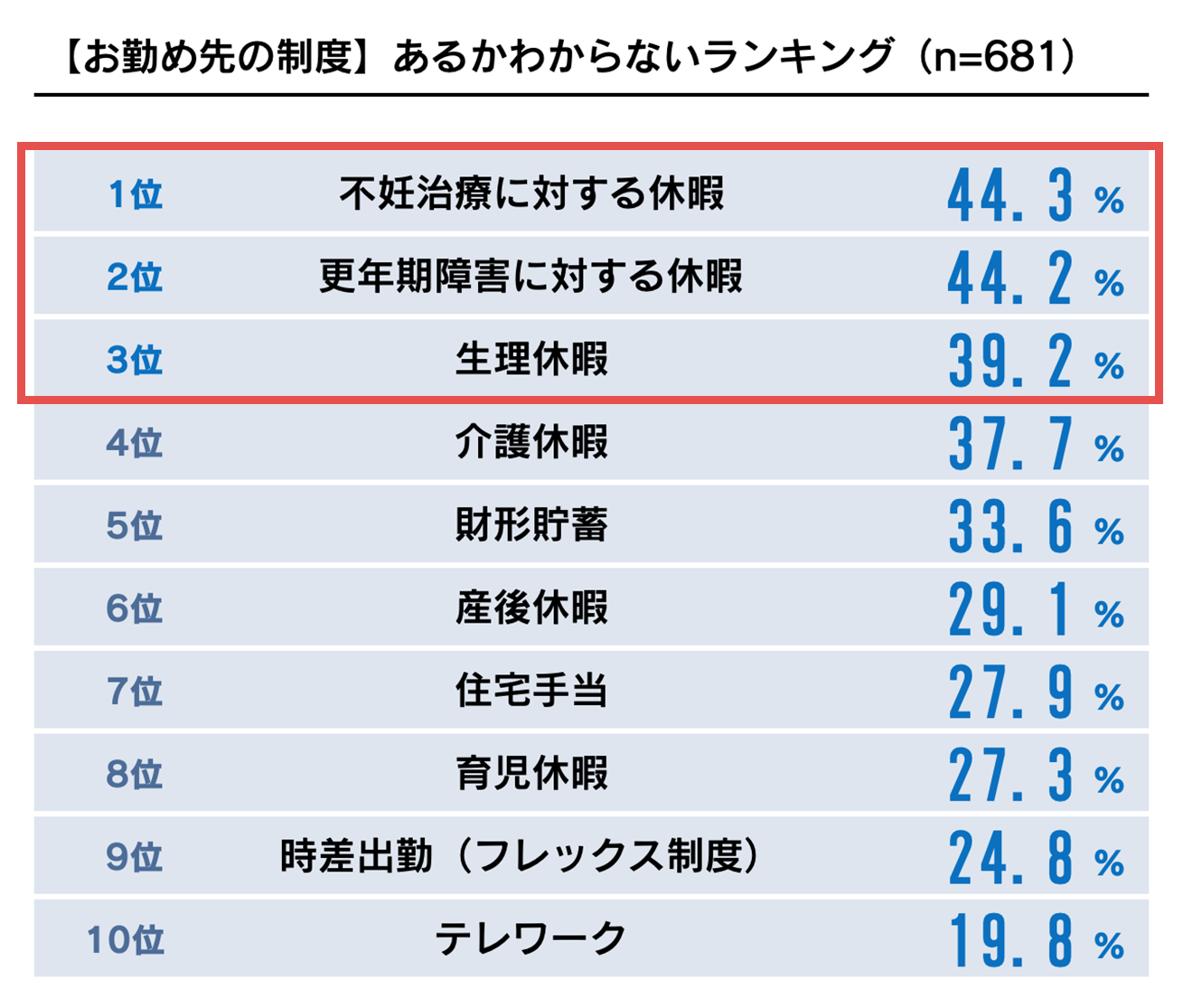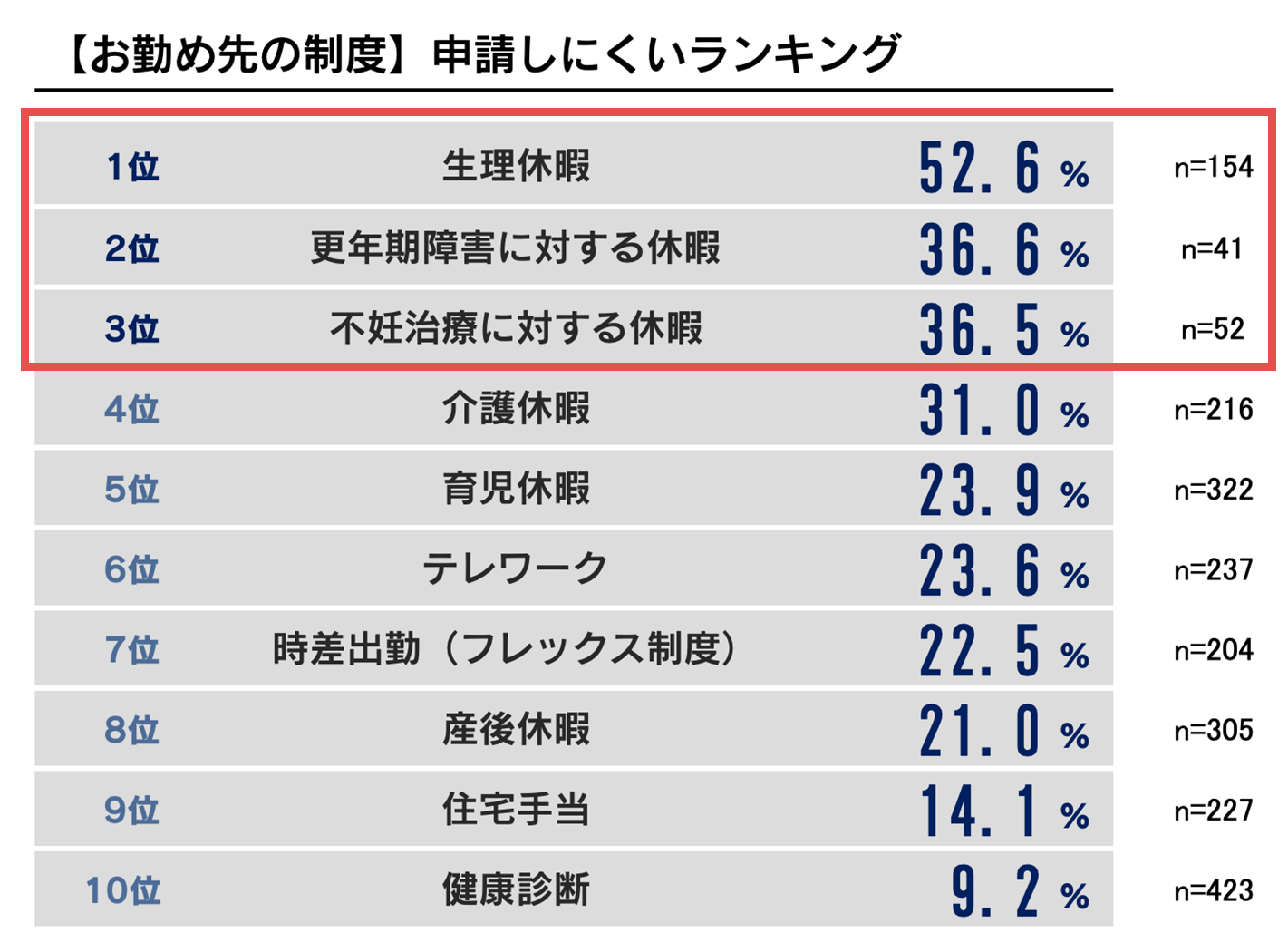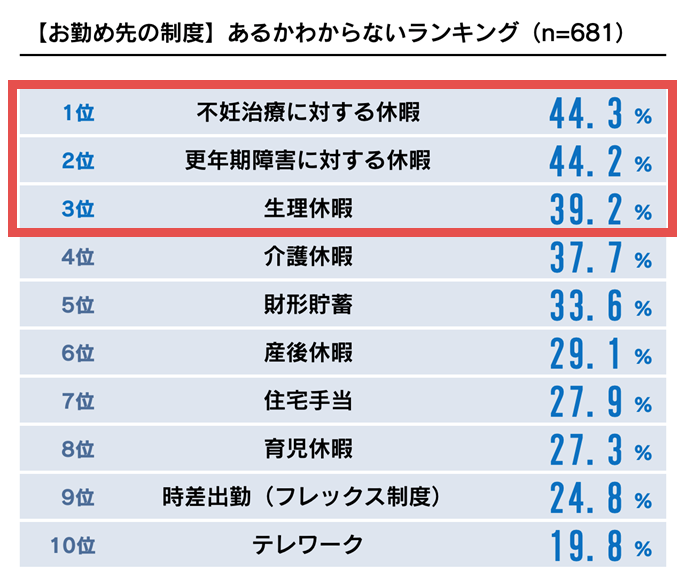 「あるかわからないランキング」のTOP3は「不妊治療に対する休暇」「更年期障害に対する休暇」「生理休暇」の3つ。「不妊治療に対する休暇」「更年期障害に対する休暇」の2つについては、女性であってもライフステージ等の違いから関心が薄いことも頷けますが、有職者の全女性が関係するであろう「生理休暇」がTOP3に入った点は驚くべきことではないでしょうか。