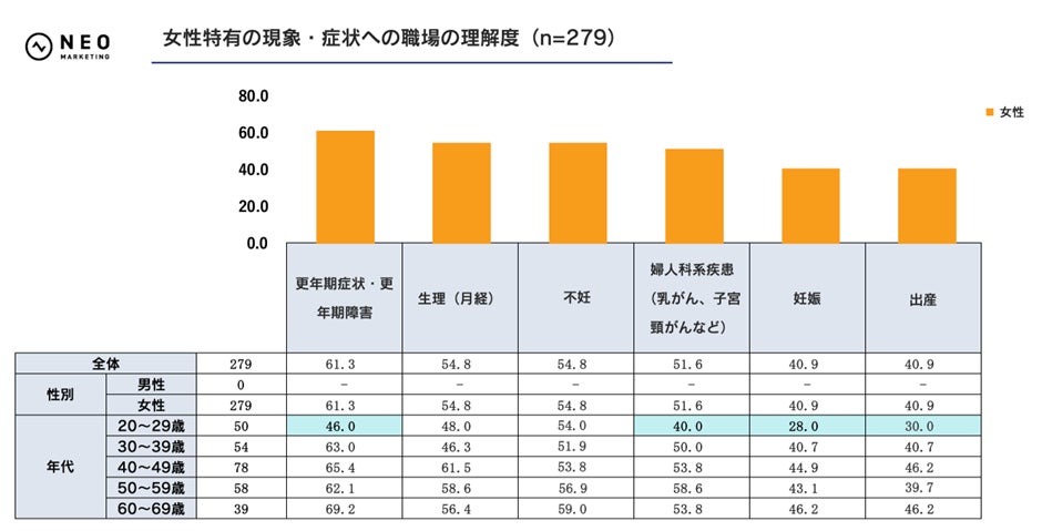 「更年期症状・更年期障害」が、最も職場で理解を得られていないと感じているようです。また年代別に比較すると、全体的に20代の割合が低くなりました。20〜29歳という年齢では経験しない現象や症状、ライフステージの違いがあることから、関心度合いに差が出た結果でしょう。