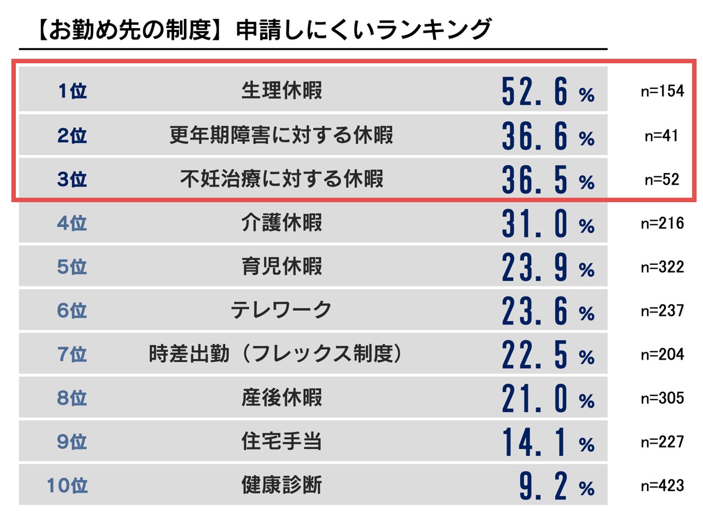 | ◆勤務先に制度が「あるかわからないランキング」のTOP3は「不妊治療に対する休暇」「更年期障害に対する休暇」「生理休暇」の3つ。 「不妊治療に対する休暇」「更年期障害に対する休暇」の2つについては、女性であってもライフステージ等の違いから関心が薄いことも頷けるが、有職者の全女性が関係するであろう「生理休暇」がTOP3に入った点は驚くべき結果だ。 ◆「生理休暇」は、52.6%が制度があっても実際は申請しにくいと感じている。 勤務先の制度の申請のしやすさをランキング化したところ、2位と3位の「更年期障害に対する休暇」「不妊治療に対する休暇」はそれぞれ36.6%・36.5%である一方、「生理休暇」は52.6%と突出して高い割合となった。 |