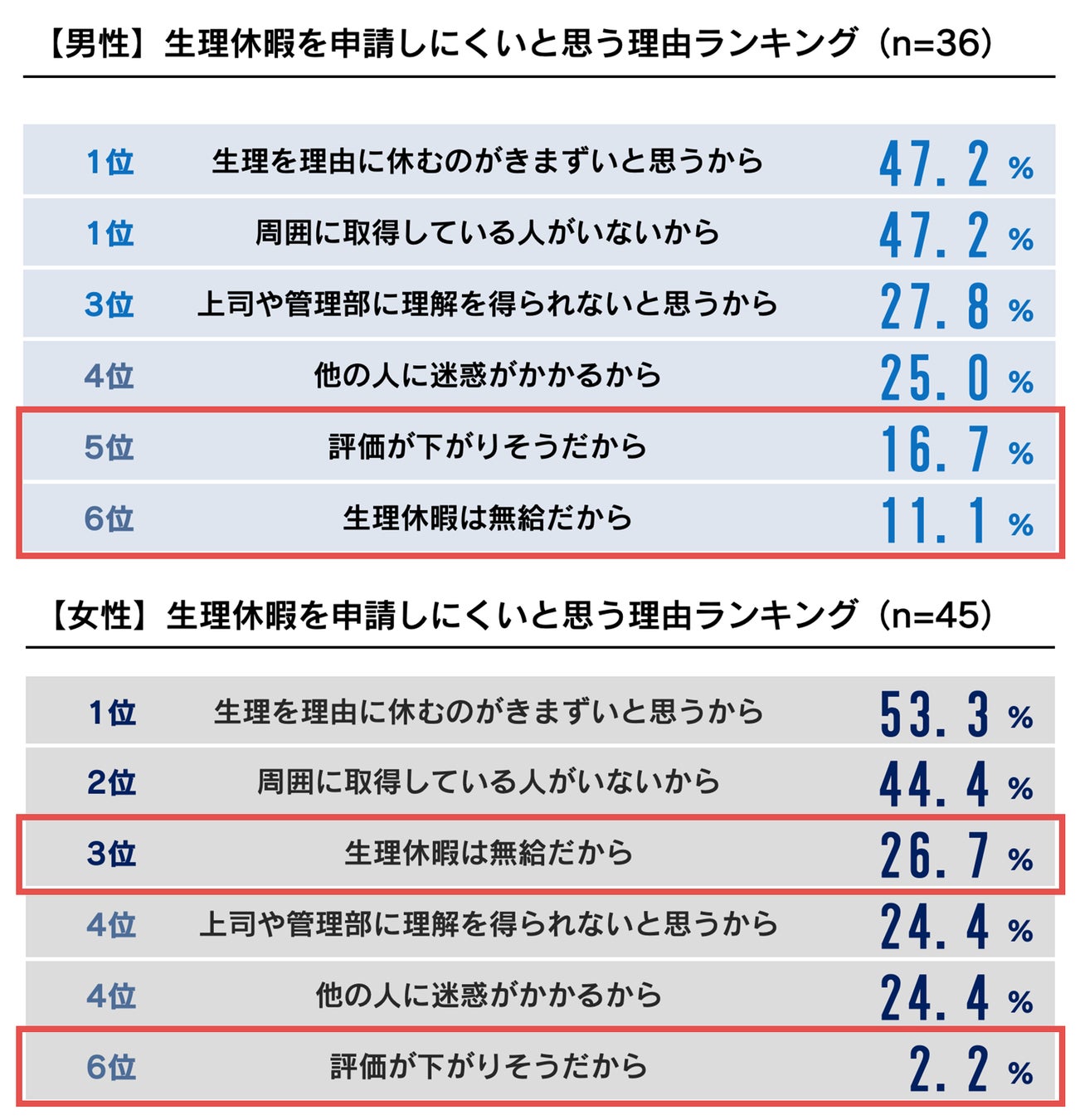 男女で結果を比較すると、「生理休暇は無給だから」「評価が下がりそうだから」という理由に差が生じていました。特に前者について男性は11.1%で6位である一方、女性は26.7%で3位にランクインしています。