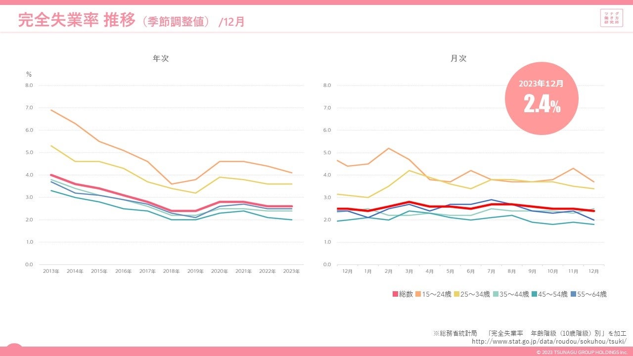 完全失業率(季節調整値)は2.4%で、前月差-0.1ポイント、前年同月差-0.1ポイントとなりました。年齢階級別では、25-34歳(+0.3ポイント)、35-44歳(+0.1ポイント)が前年同月より悪化しました。