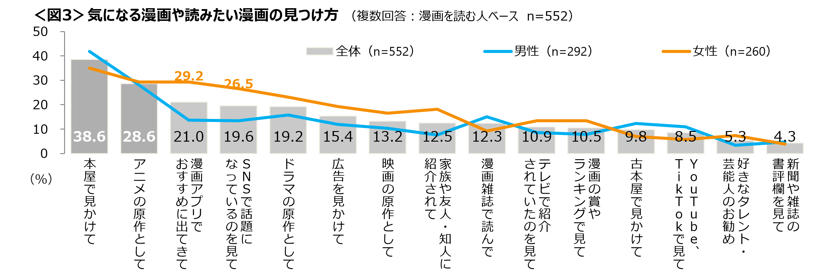 気になる漫画・読みたい漫画は、本屋で見つけたりアニメの原作として知ったりすることが多い。女性は、アプリ内のおすすめやSNSで話題になっている作品から知る人が多い様子。<図3>