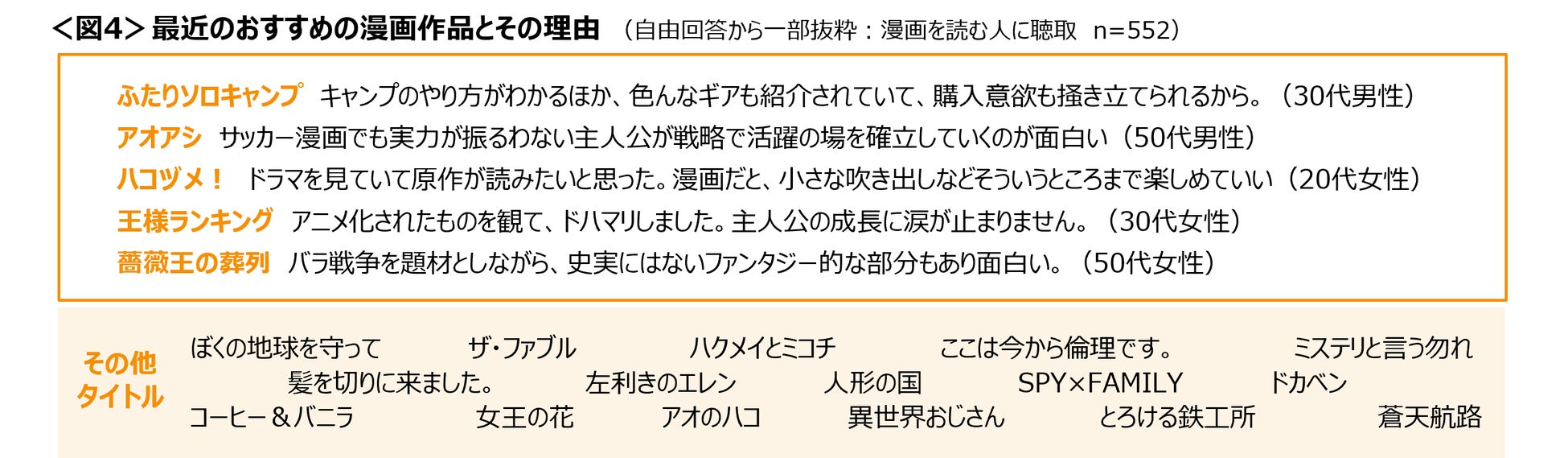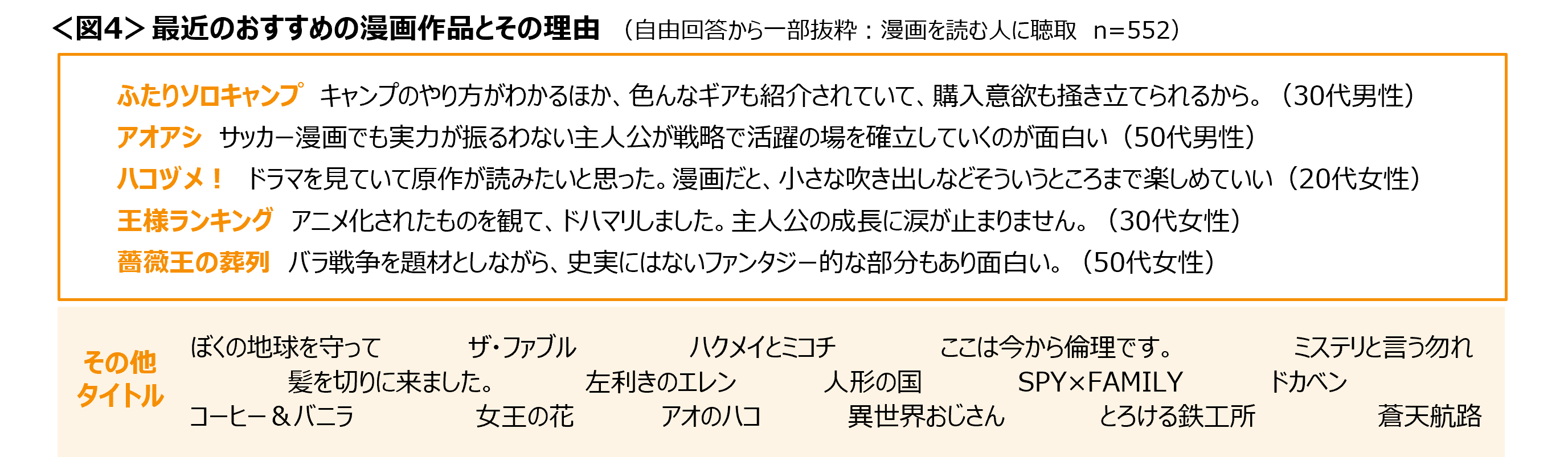 最近のおすすめの漫画作品を聴取したところ、映画化・ドラマ化した作品や今年からアニメが始まった作品などをあげる声が多い。<図4>