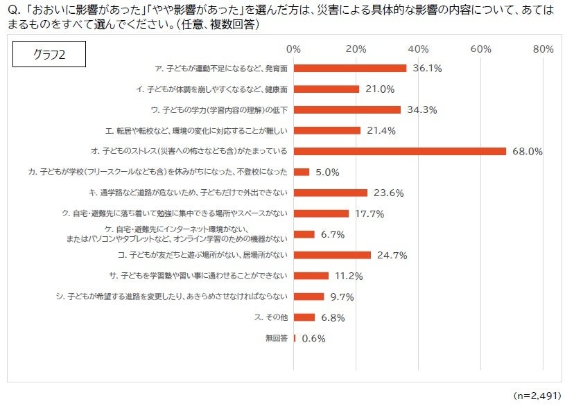 具体的な影響(グラフ2)としては、子どものストレスが68.0%と最も多く、次いで運動不足などの発達面が36.1%、学力の低下が34.3%、遊び場などの居場所の不足が24.7%、通学路などの道路状況が23.6%となっています。これらの結果から、継続的に子どものこころのケアに取り組んでいくこと、学習や教育環境の整備、思い切り体を動かし安心して過ごせる場所や機会づくりの重要性が浮き彫りとなっています。