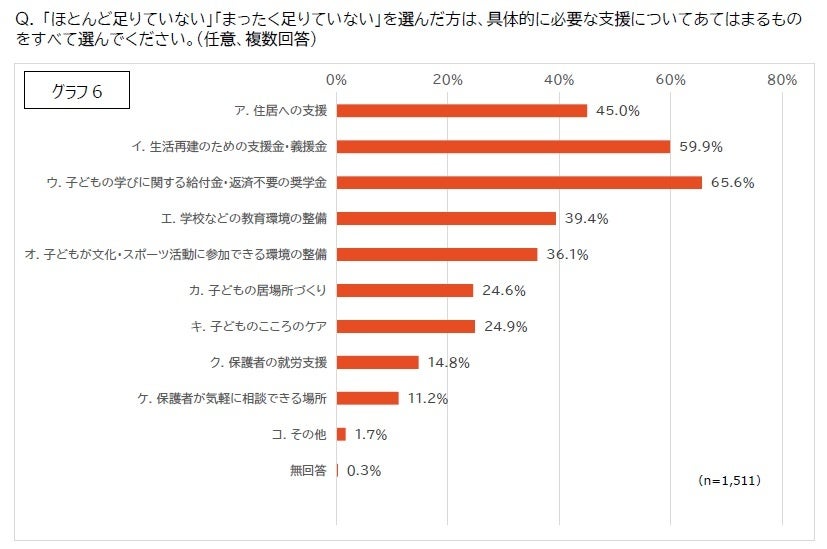 被災した子どもや子育て世帯への公的制度や支援の状況についてたずねたところ(グラフ5)、「まったく足りていない」への回答が13.2%、「ほとんど足りていない」が39.2%で、合わせて52.4%が公的制度や支援が不足していると回答しました。具体的に必要な支援(グラフ6)としては、子どもの学びに関する支援金が65.6%、次いで生活再建に対する支援が59.9%、住居への支援が45.0%、教育環境の整備が39.4%、文化・スポーツ活動の環境整備が36.1%となっています。