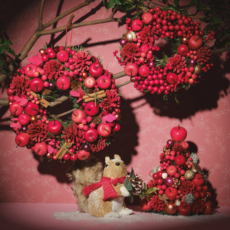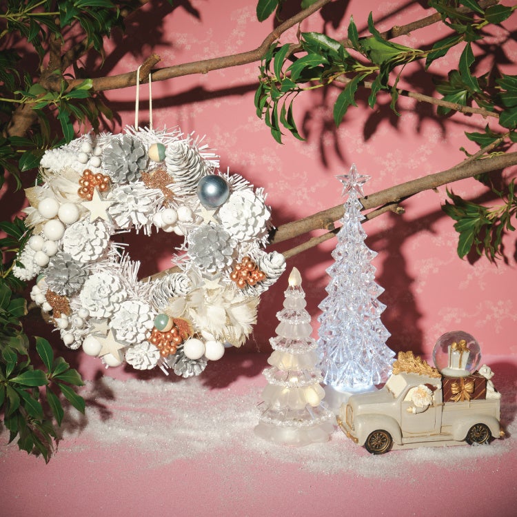 インテリアに合わせて選べるホワイトカラーのリースやリンゴの形のスノードームなど、デコレーションアイテムも揃います。