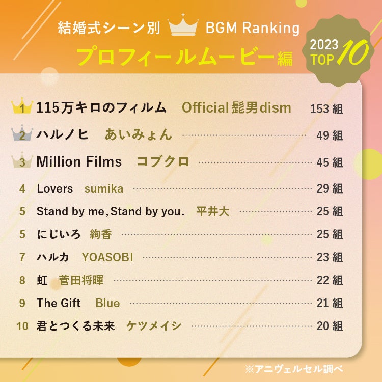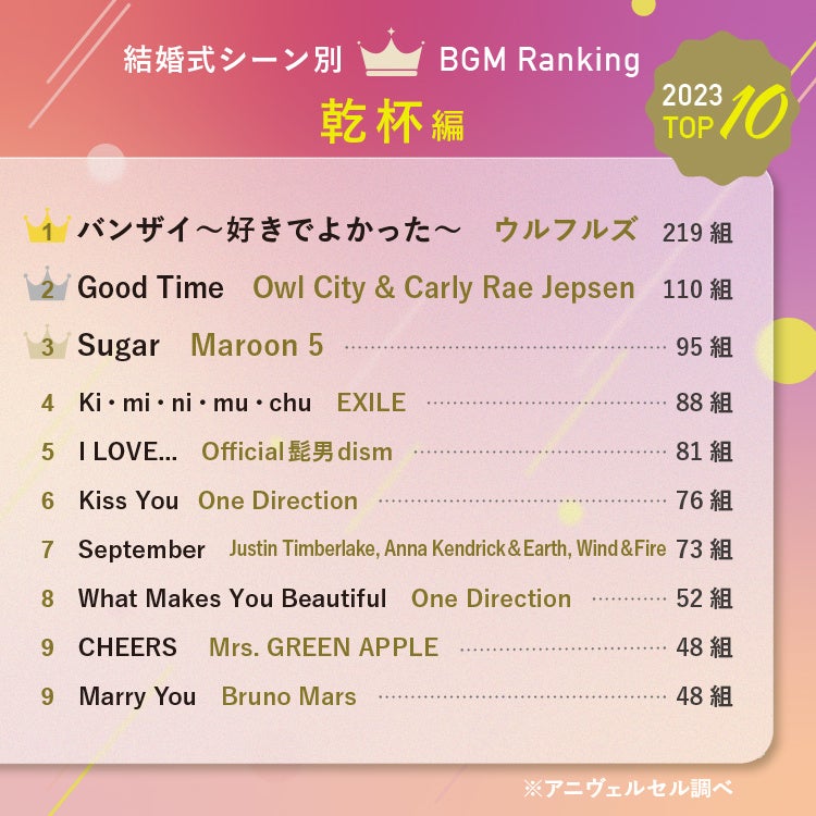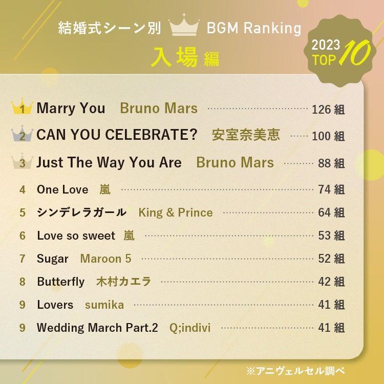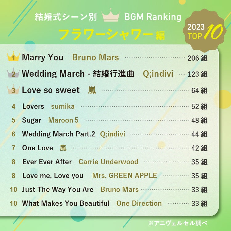 2023年にアニヴェルセルの結婚式で使用された全楽曲から選ばれた総合ランキングは以下の通りです。