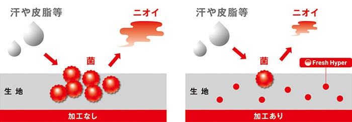 『Pure Hyper』は、菌が汗や皮脂を分解することでニオイ成分が発生することに着目し、ニオイの元になる繊維上の菌の増殖を抑制します。